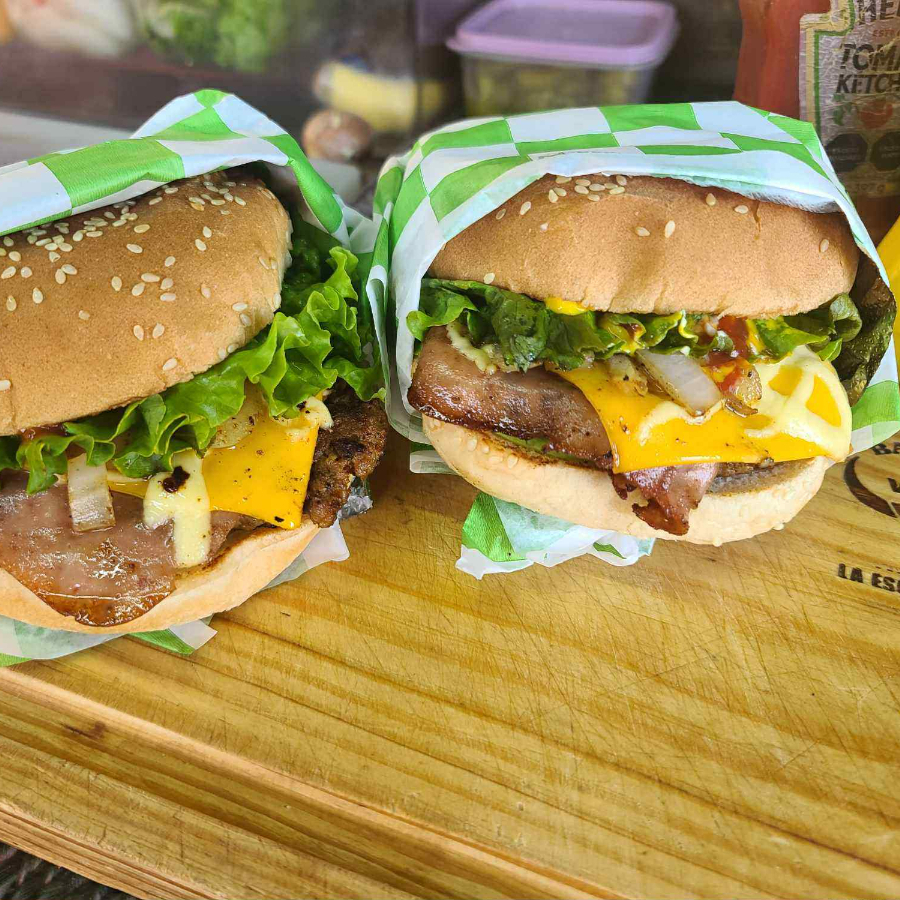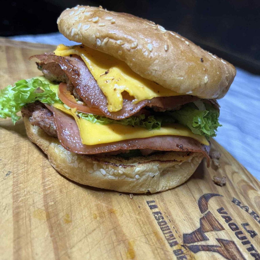 Hamburguesa Con 2 jugosas carnes casera, acompañado de Doble Jamon, Doble Queso Americano, Pepinillo, Tomate,Cebolla, Mayonesa, Ketsup y Mostaza