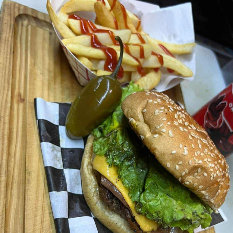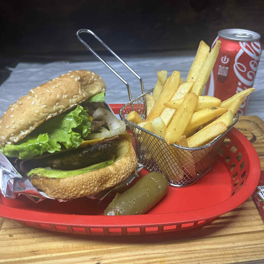 Carne De Res Casera, con Lechuga, Tomate,Cebolla, Queso Americano y Una Orden de papas Para acompañar. Pepinillos y Jamon