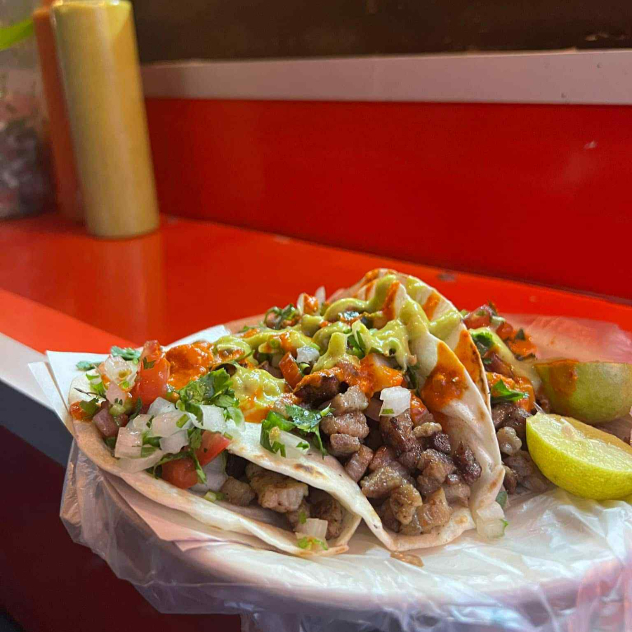 Tacos de Brisket, Pico De Gallo, Guacamole, Salsa Quemada y Salsa Roja