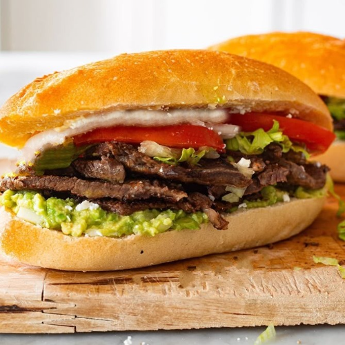 Pan telera, frijoles, lechuga, tomate, aguacate, queso asadero y ternera. incluye: papas fritas, jalapeño y catsup
