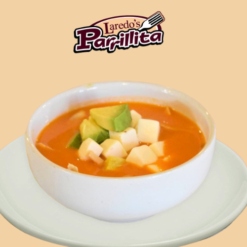 Caldo de jitomates molidos, ajo, cebolla, sazonado con epazote, tiras fritas de tortilla de maíz, chile pasilla, aguacate y queso asadero.