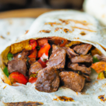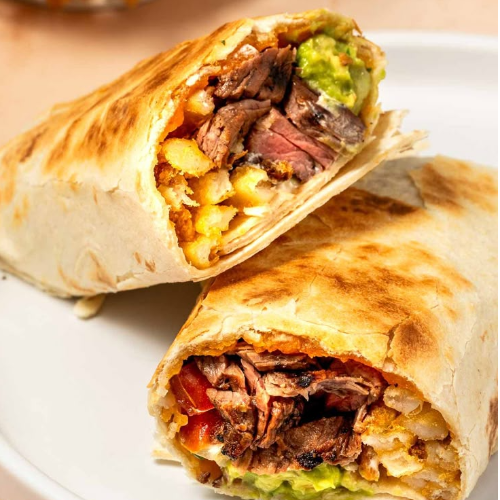 Burrito con queso asadero, guacamole, tortilla de harina aprox 30 cm con cebolla asada y chile morrón, salsa y totopos