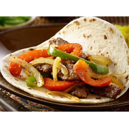 Tortilla de harina aprox 30 cm con cebolla asada y chile morrón, salsa y totopos