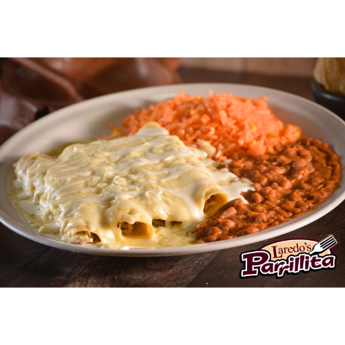 Enchiladas de pollo, queso, crema, arroz y frijoles.