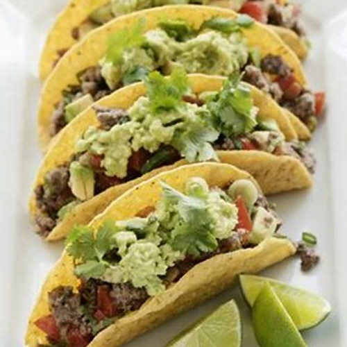 4 tacos de tortilla de harina con guacamole, cebolla asada, totopos, salsa y limones