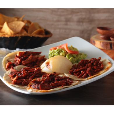 4 tacos de tortilla de maíz con guacamole, cebolla asada y fajita. totopos, salsa y limones