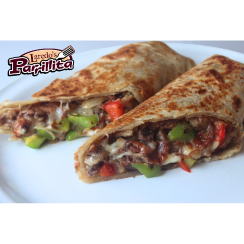 Burrito con queso asadero, tortilla de harina aprox 30 cm con cebolla asada y chile morrón, salsa y totopos