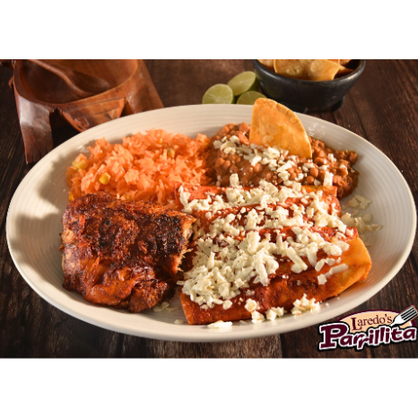 Enchiladas rojas con pollo asado, arroz y frijoles.