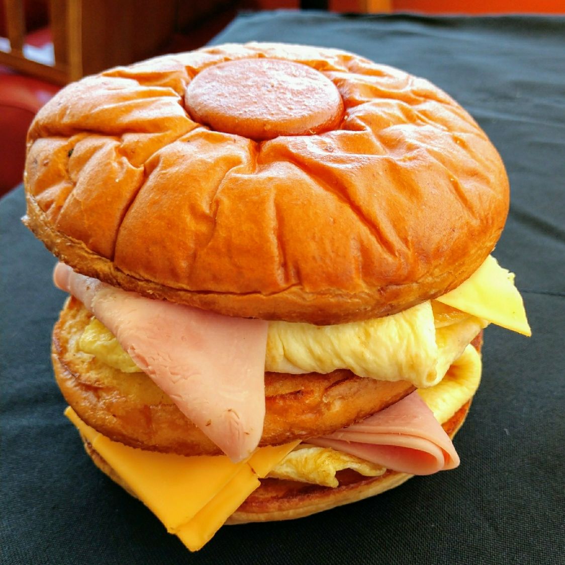 Con dos huevos, jamón y queso amarillo.