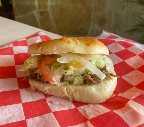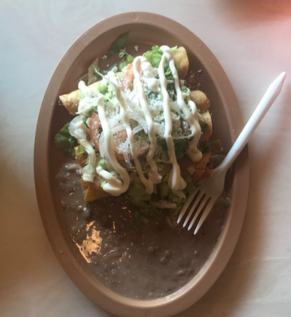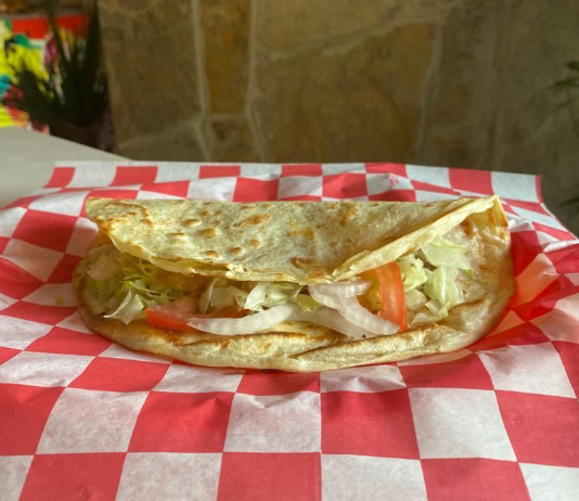 Con tortilla de maíz, carne 60 g, lechuga, tomate, cebolla, queso, crema y frijoles.