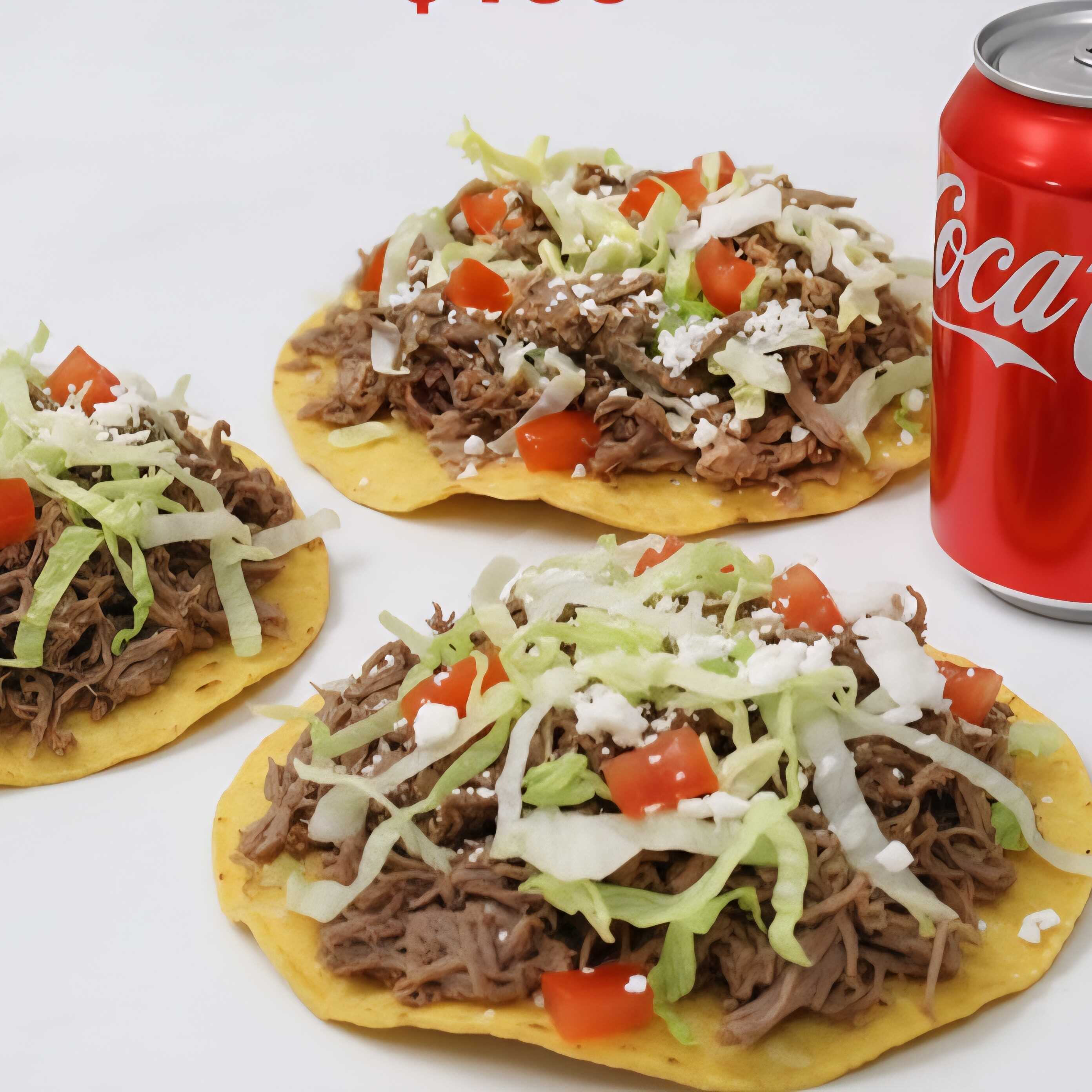 3 tostadas de ternera incluye frijoles, lechuga, tomate, queso fresco,& 1 coca de 355ml