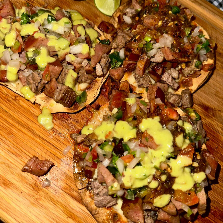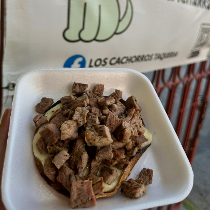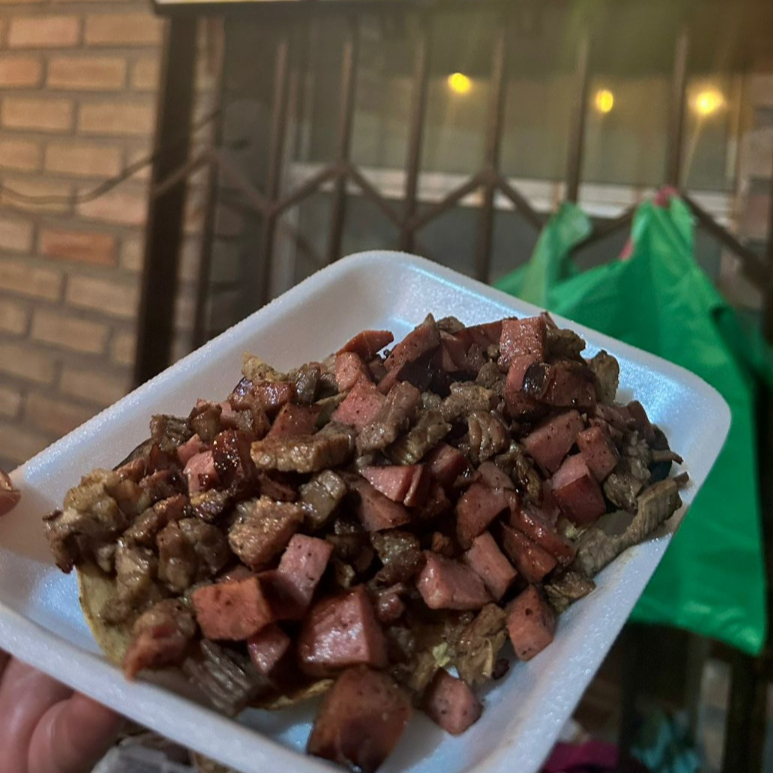 Crujiente tortilla de maiz, queso fundido con carne asada y salchicha polones
