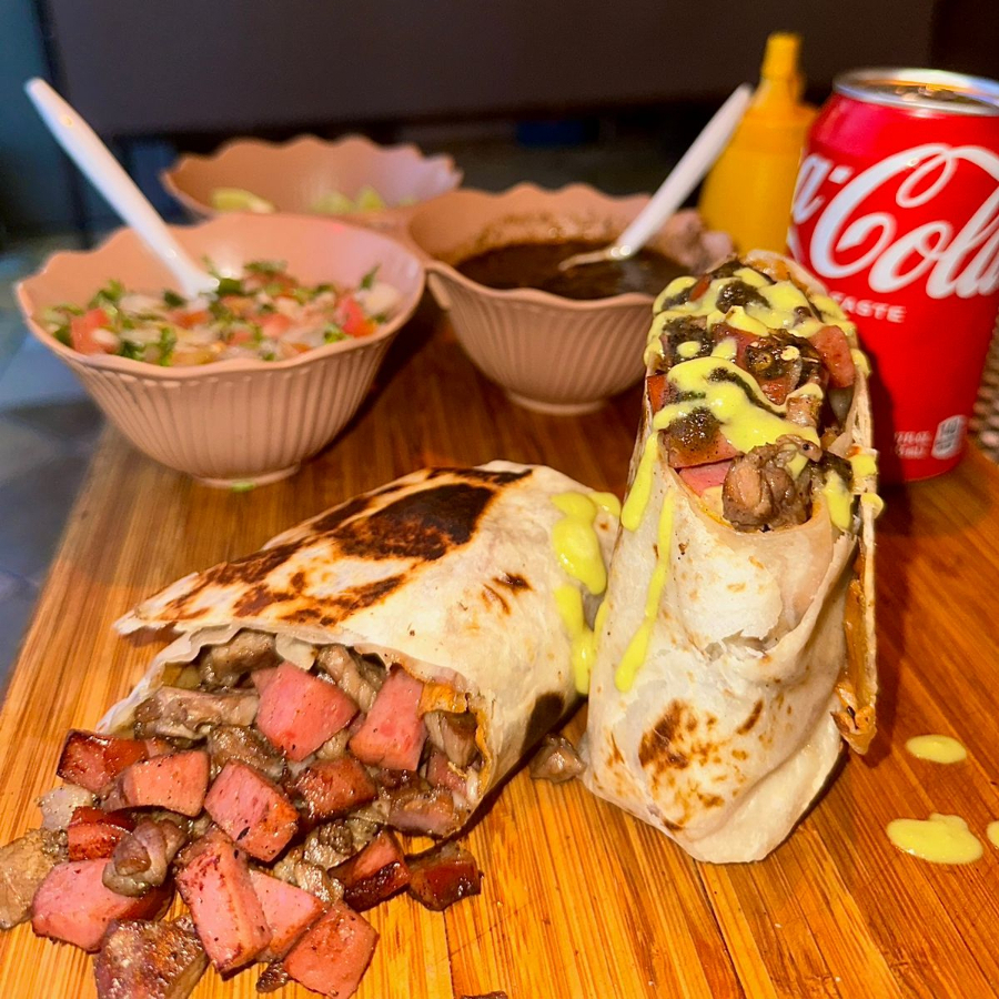 Tortilla de harina con costra de queso relleno de carne asada con polones