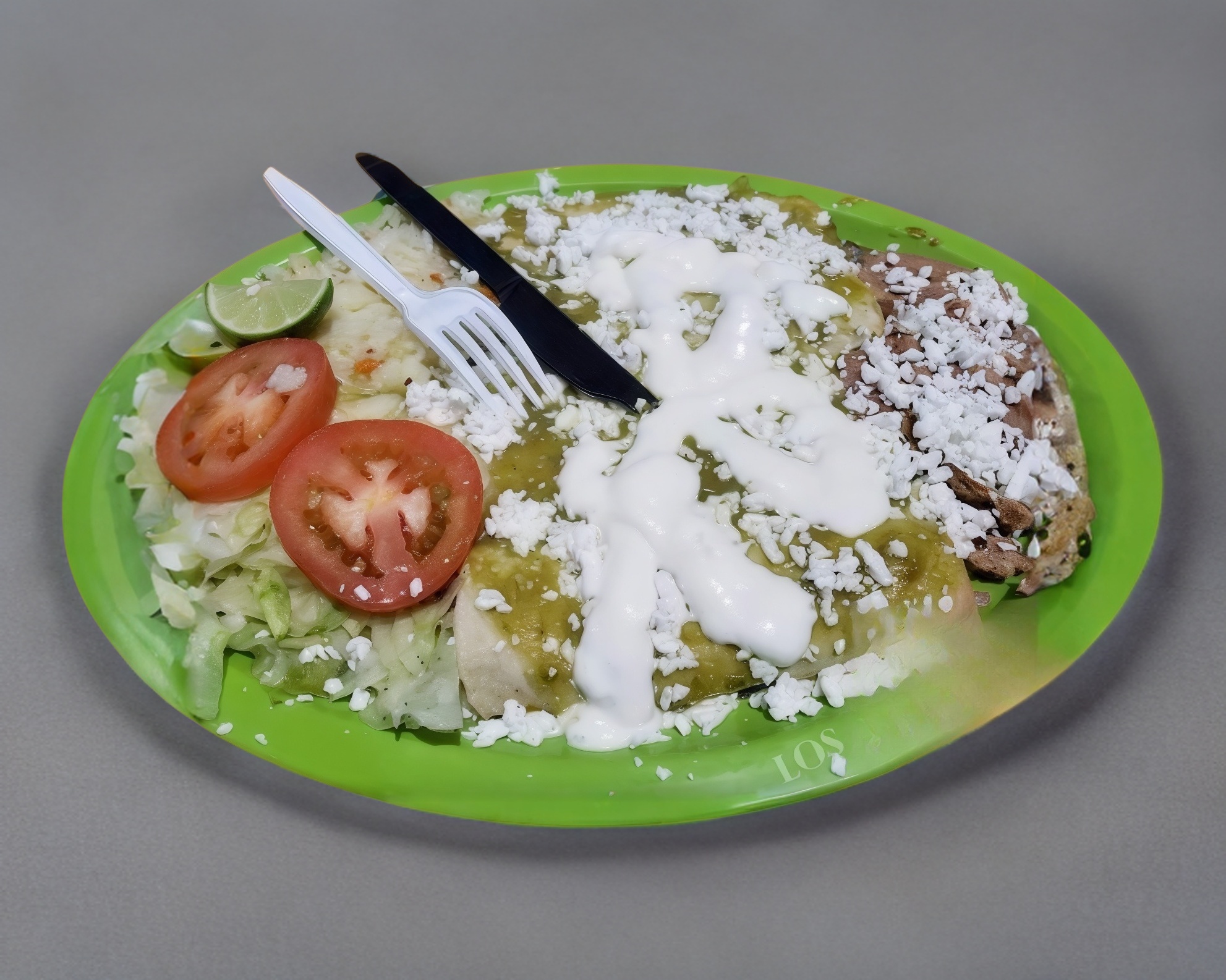 Platillo con cuatro enchiladas guisado a elegir, bañadas en salsa verde o roja y queso derretido, acompañadas con frijoles al lado, lechuga y tomates, incluye salsa, limones y pico de gallo en bolsa.