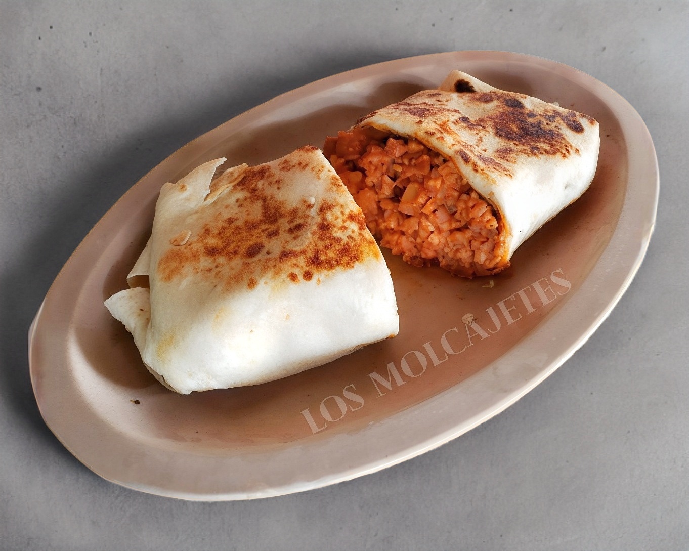 Tortilla de harina tipo burrito con queso, carne al pastor y carne asada, incluye salsa, limones y pico de gallo en bolsa.