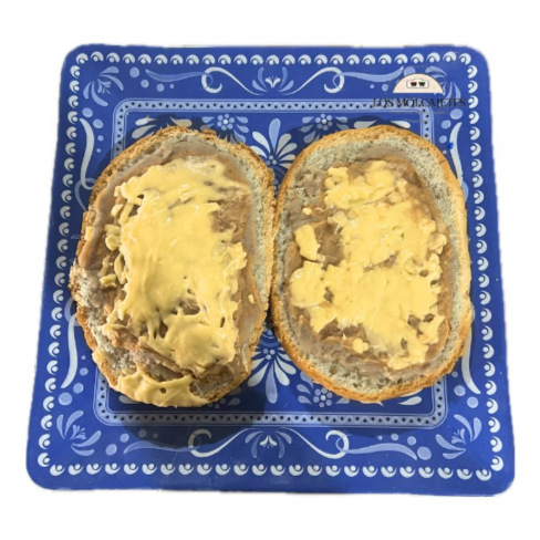 Par de panes caseros con frijol en la base y un puño de queso asadero, incluye salsas