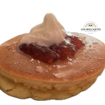 Desayunos - 3 Hot Cakes con mermelada de fresa, azucar glass espolvoreado y crema batida