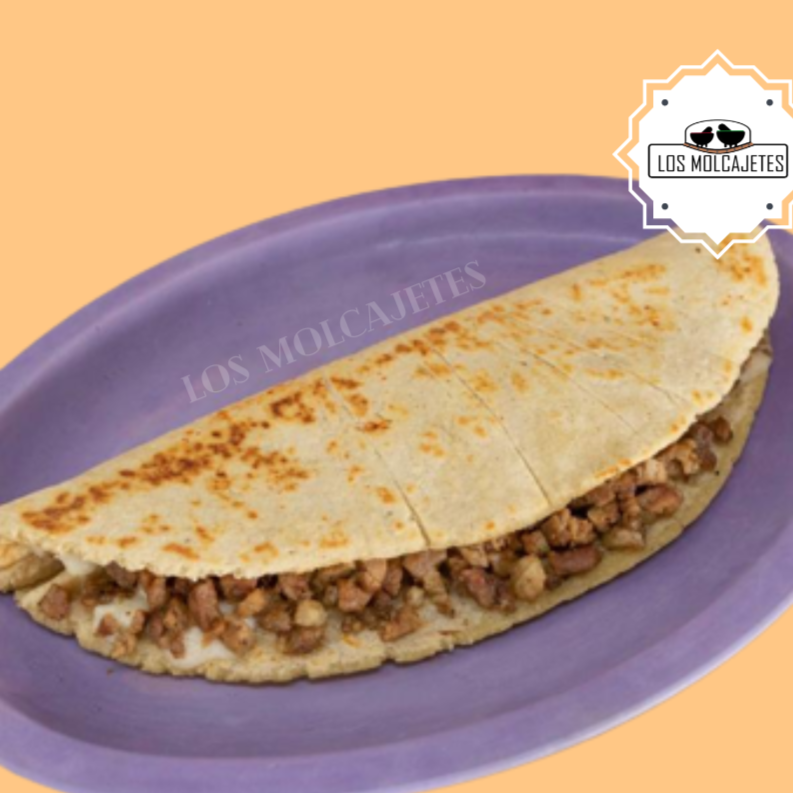 Quesadilla de gran tamaño con tortilla de maíz hecha a mano, con su respectivo queso derretido en la base más los guisados que guste, incluye salsa y pico de gallo en bolsa.