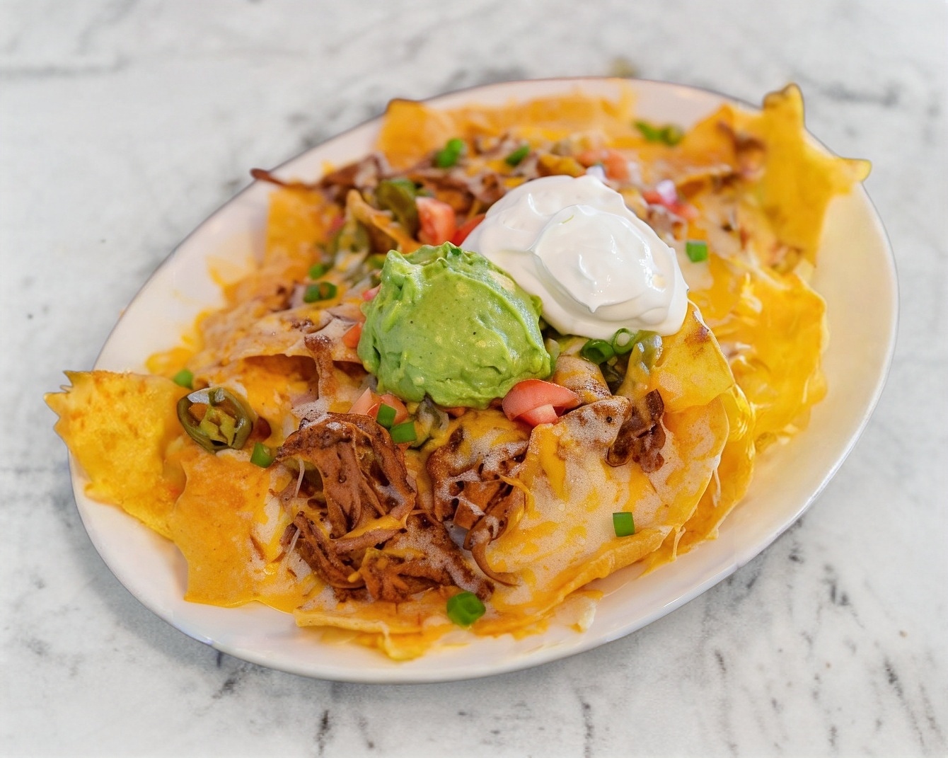 Nachos al estilo tapatío; tortillitas doradas con una capa de frijoles refritos, gratinados con queso americano amarillo, y queso mozzarella rallado, pico de gallo, riquísima birria que nos caracteriza, guacamole y crema encima.