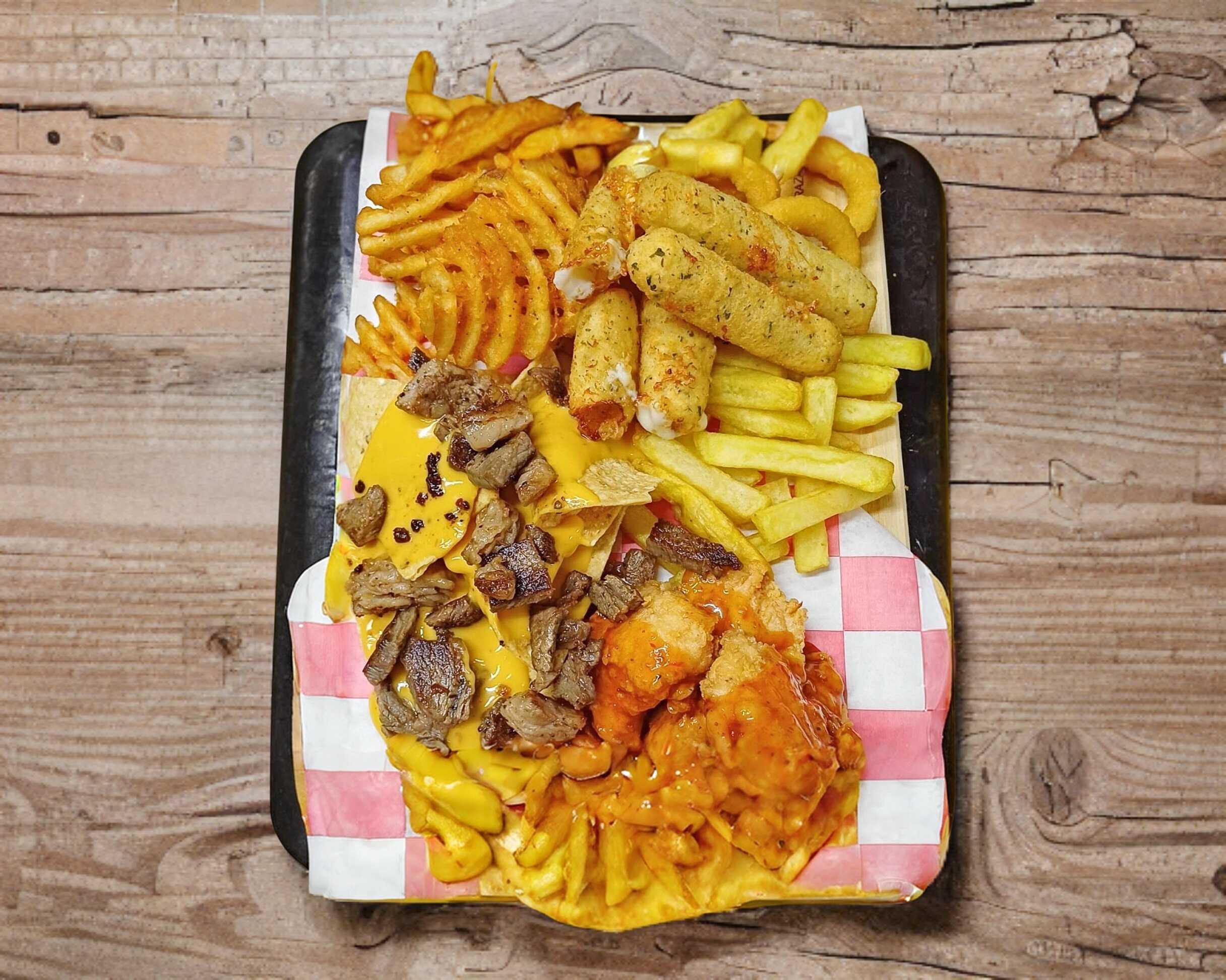Dedos de queso, Aros de cebolla, Papas criscut, Boneles, Panchos con carne, Papas con queso y Papas fritas sazonadas.