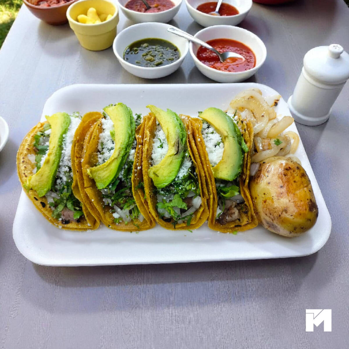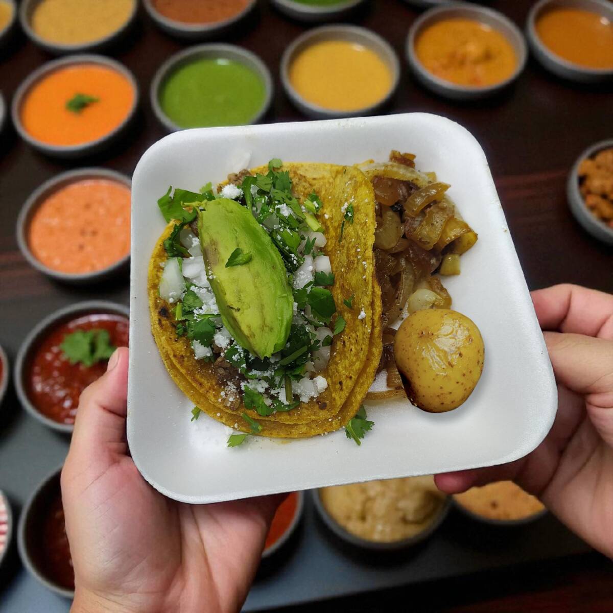 Taco de bisteck con: cebolla, cilantro, queso y aguacate. Acompañado de cebolla y papa dorada