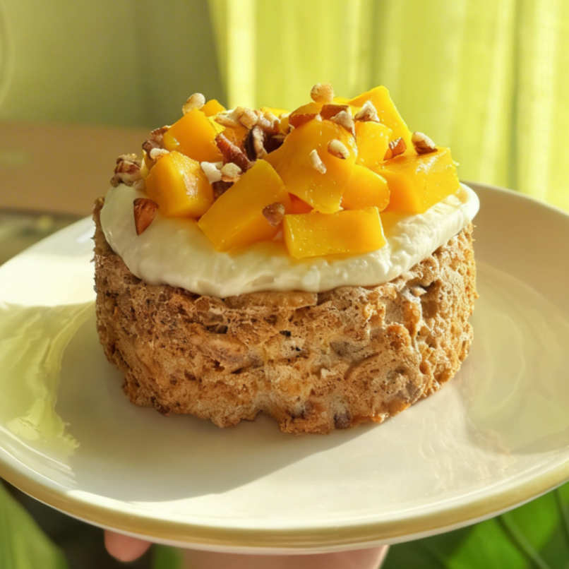 Postre con base de galleta y nuez, con crema de queso, mango y nuez como topping.