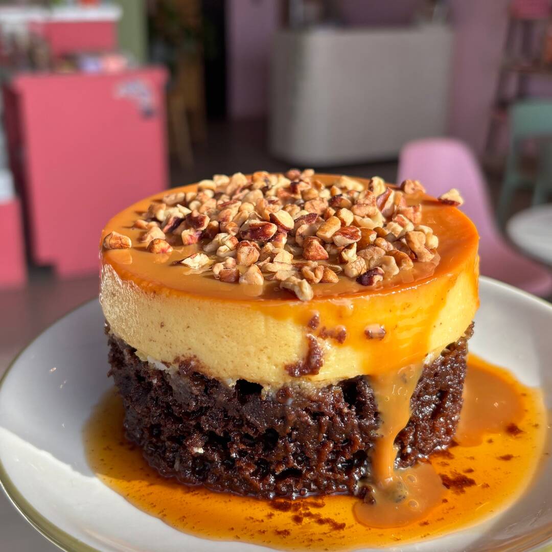 Chocoflan con flan de queso crema, dulce de leche y nuez