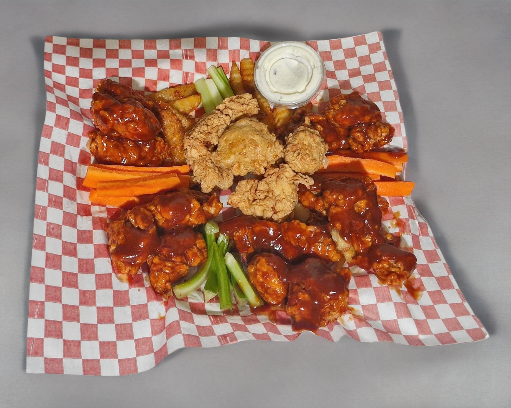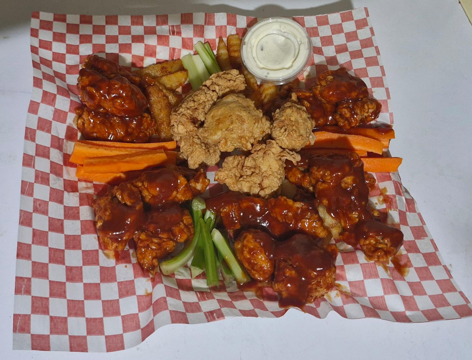Boneless 15 Pzas, 2 Sabores a Elegir de salsa , Porción de papás 80 gramos aprox, Aderezo Ranch , Zanahoria y Apio.