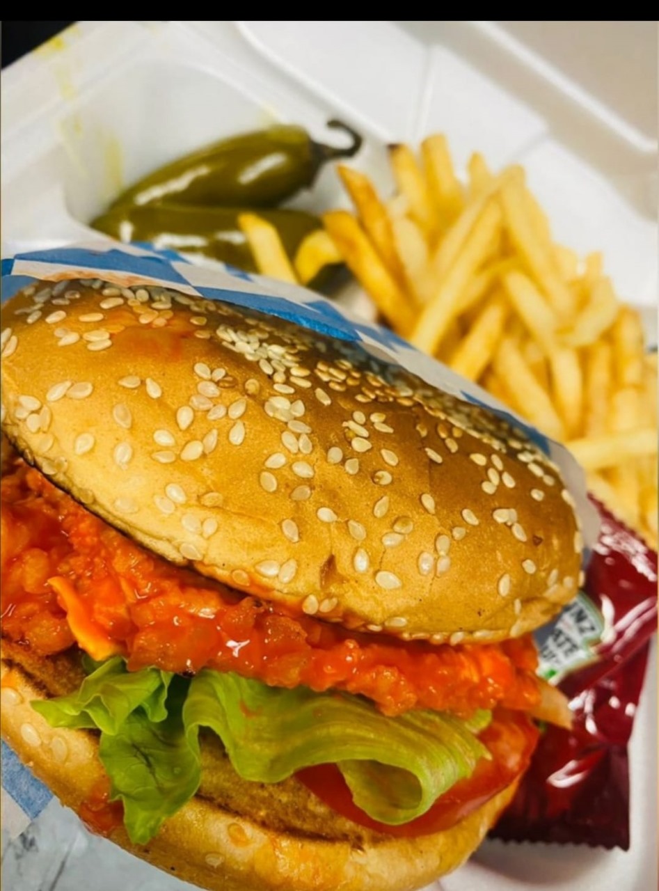 Pechuga Empanizada con Aro de cebolla, Lechuga, Mayonesa Queso Amarillo y Tomate. Pan y Hamburguesa de tamaño regular-mediano.