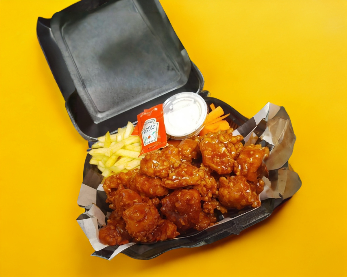 20 Pzas Boneless de Pechuga de Pollo, con 1 porcion de Papas a la francesa ,Zanahoria y Ranch.