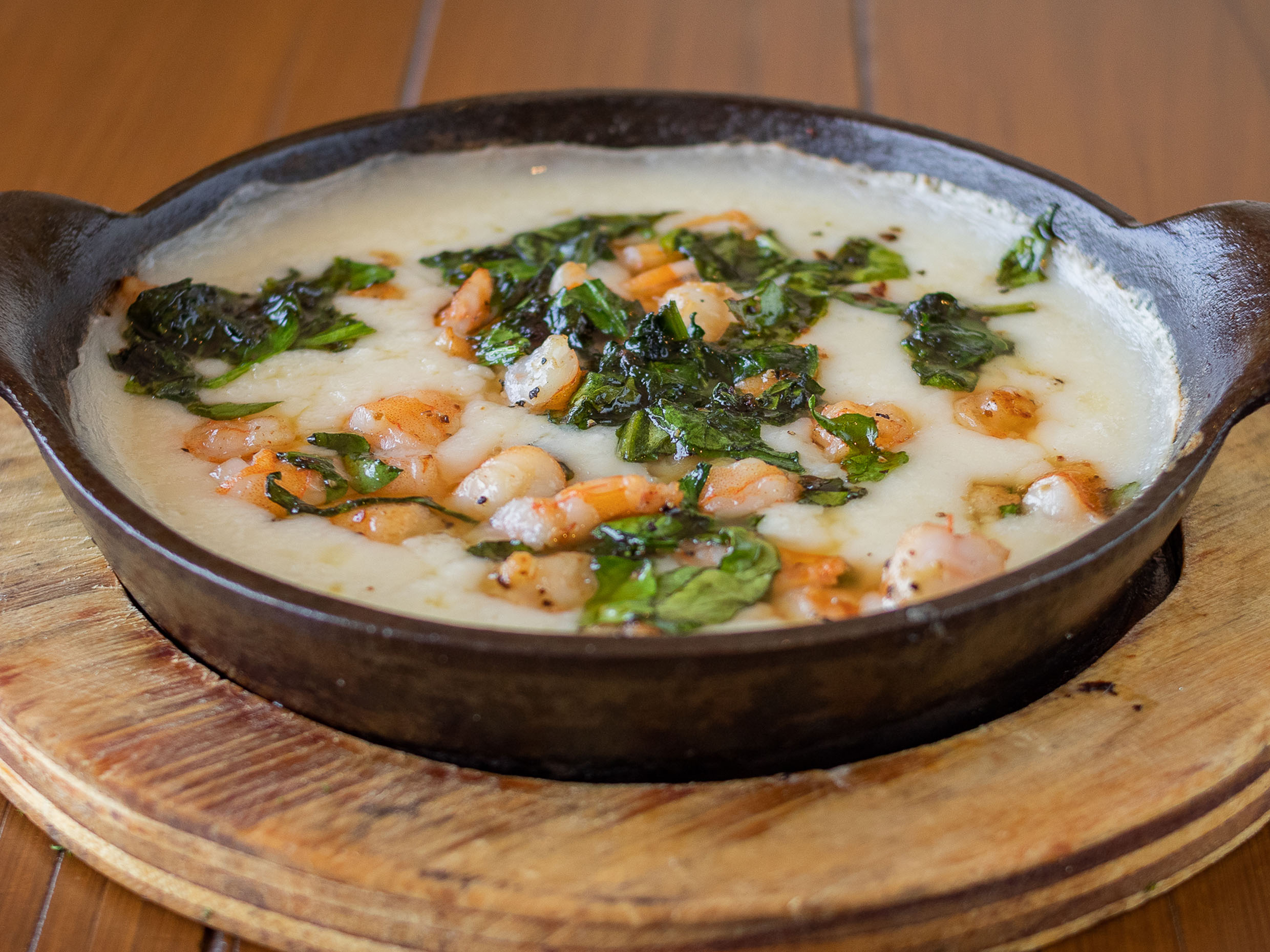 Queso mozzarella fundido con camarones y espinacas. Acompañado con baguette tostado con mantequilla y ajo.