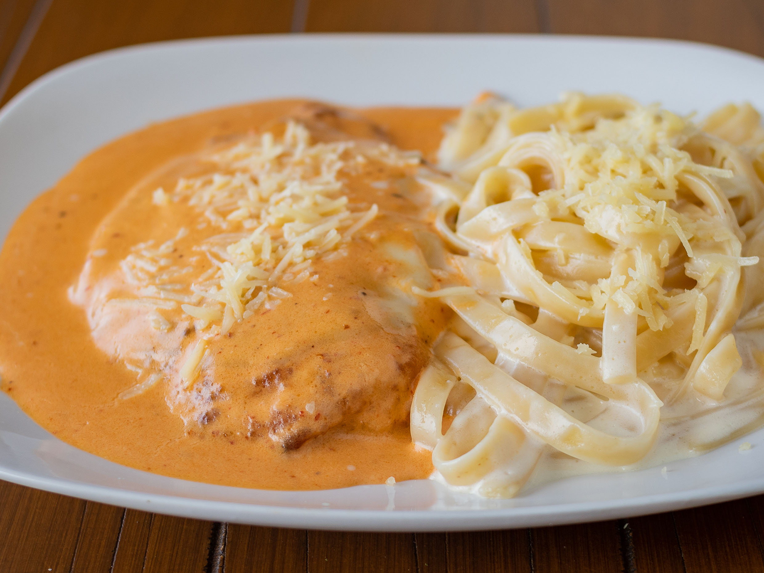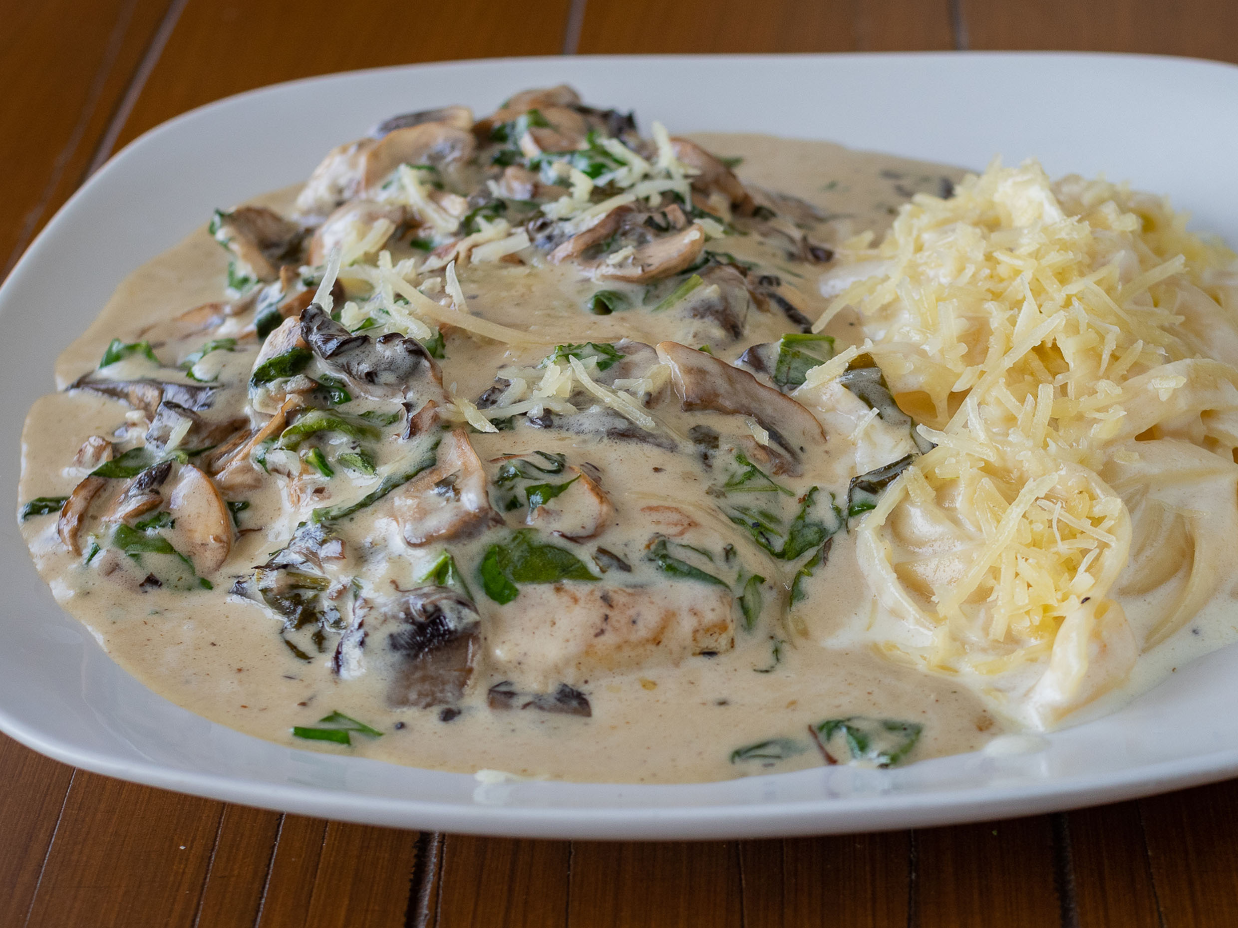 Pechuga de pollo a la placha, gratinada y bañada en salsa cremosa Alfredo, con championes y espinacas. Guarnición a elegir.