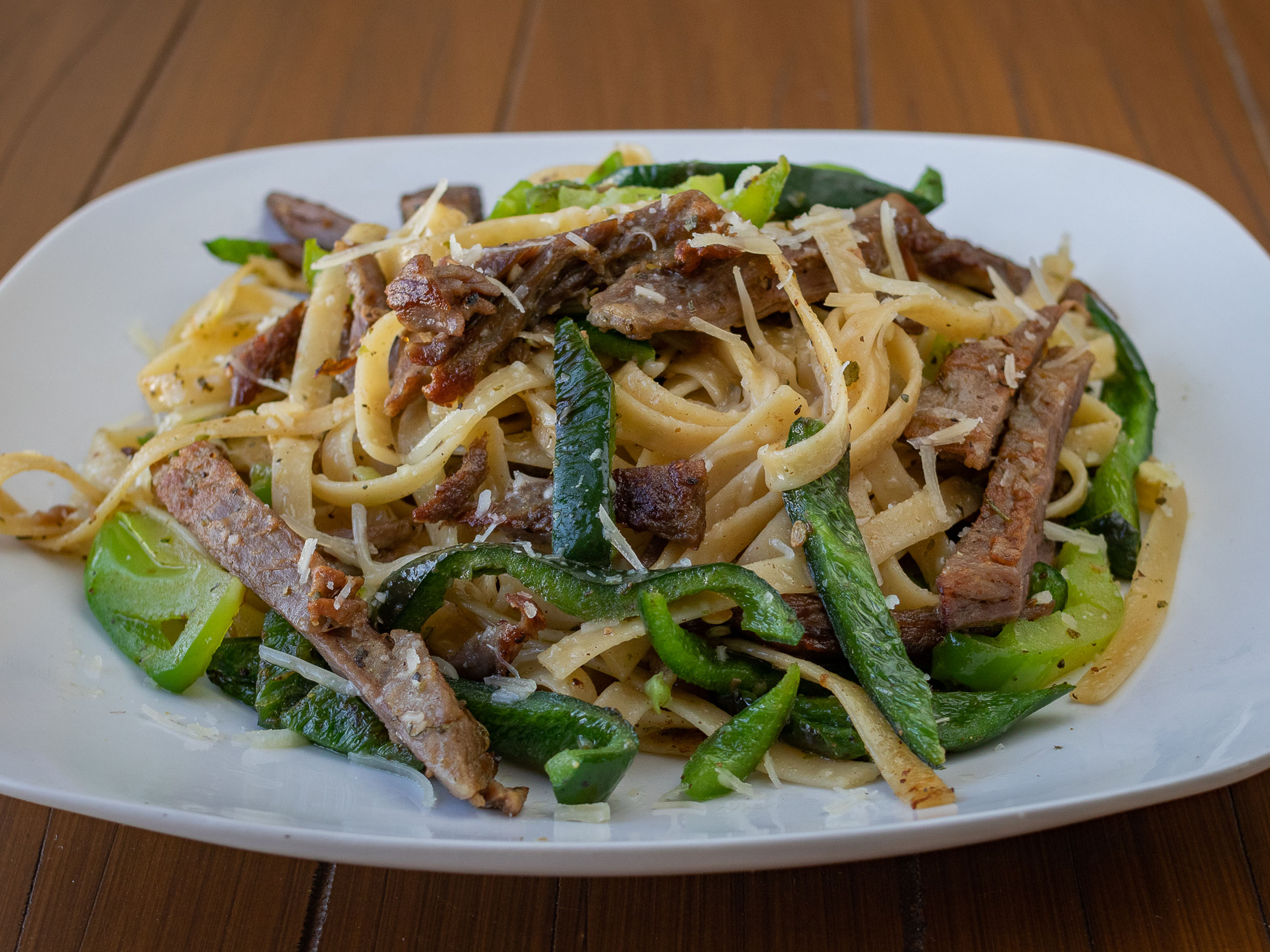 Pasta fetuccini a las finas hierbas, con trocitos de arrachera, chile poblano, chile morrón y queso parmesano.