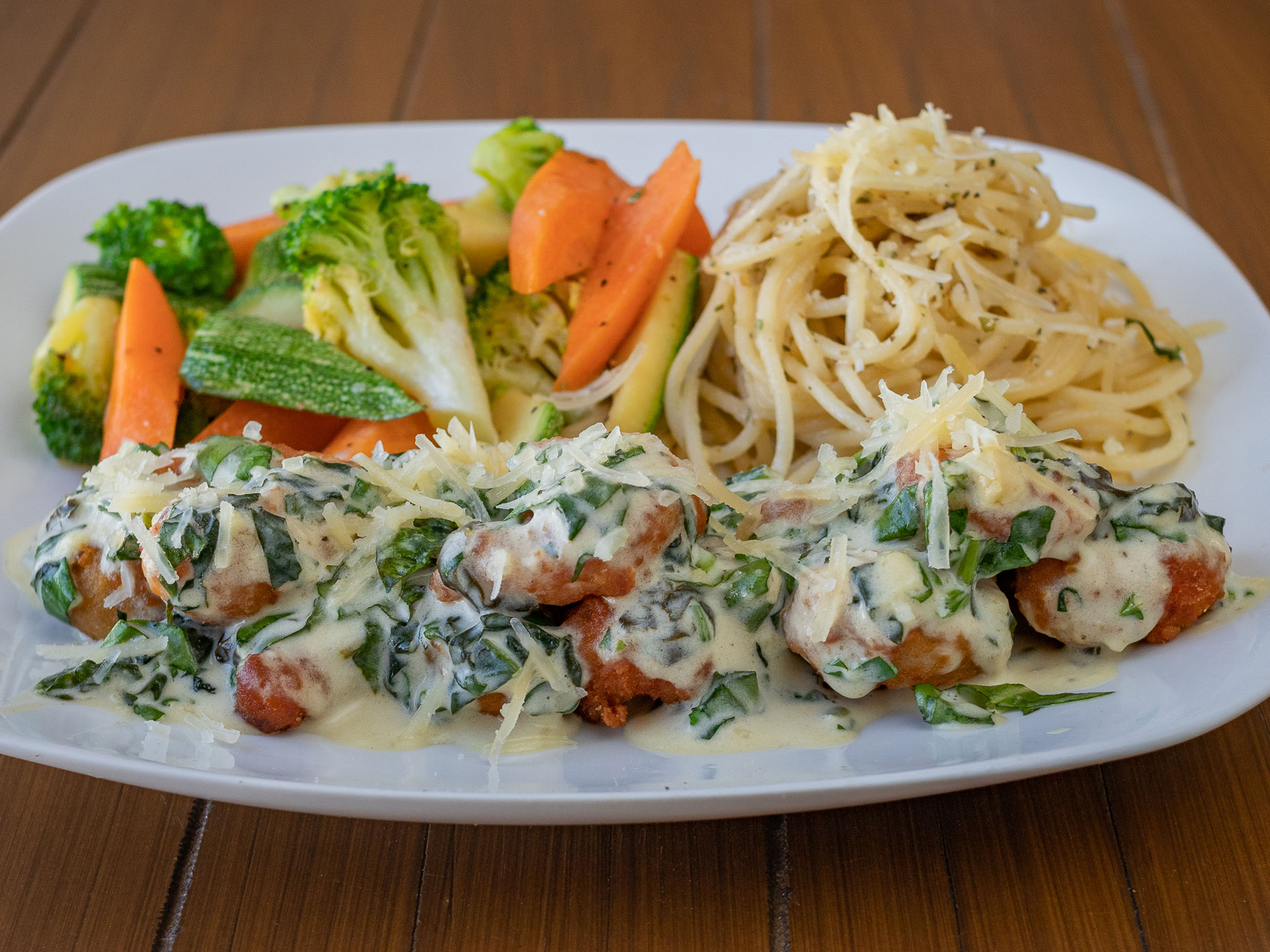 Camarones empanizados con pan molido y especias; bañados con salsa Italiana cremosa a base de mantequilla y limón con espinacas. Guarnición de spaguetti a las finas hierbas y vegetales a la mantequilla.