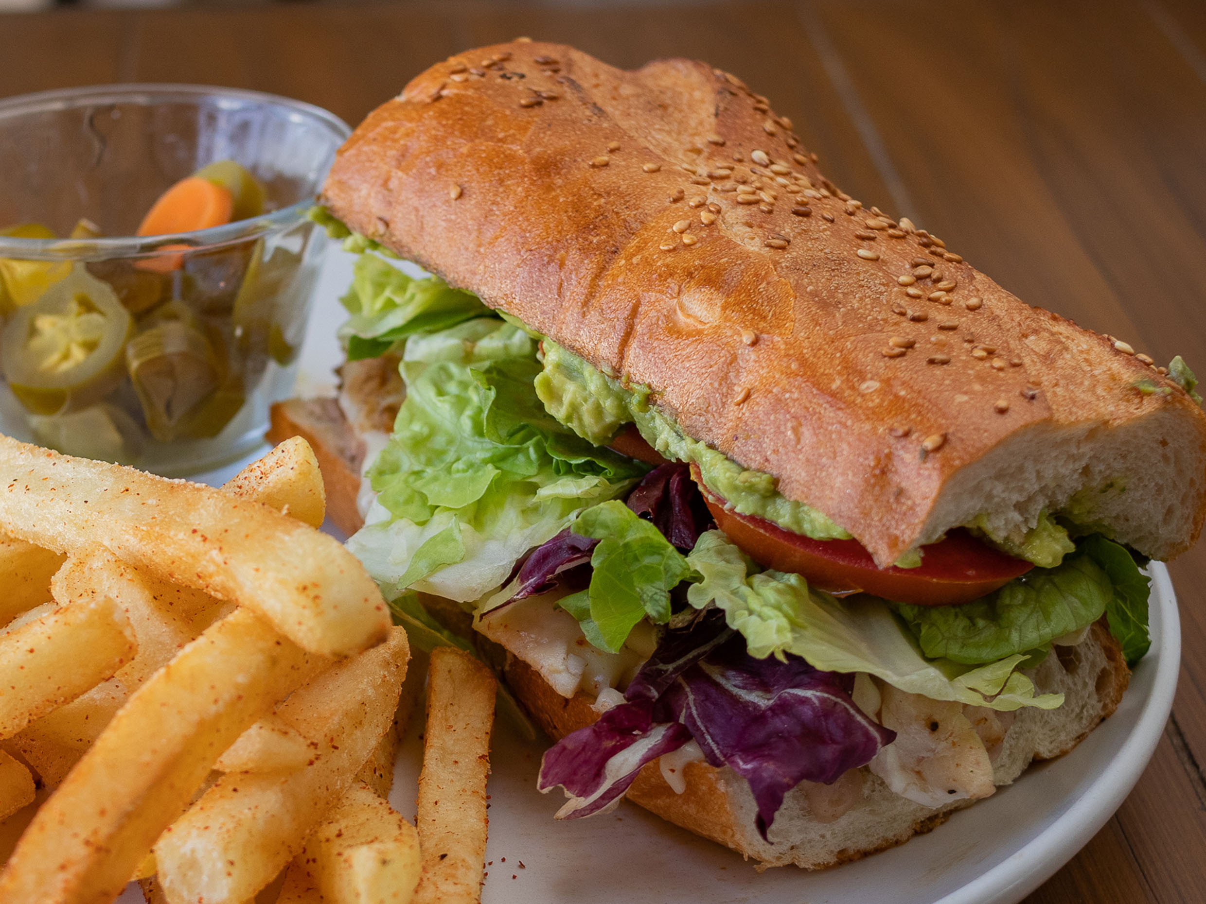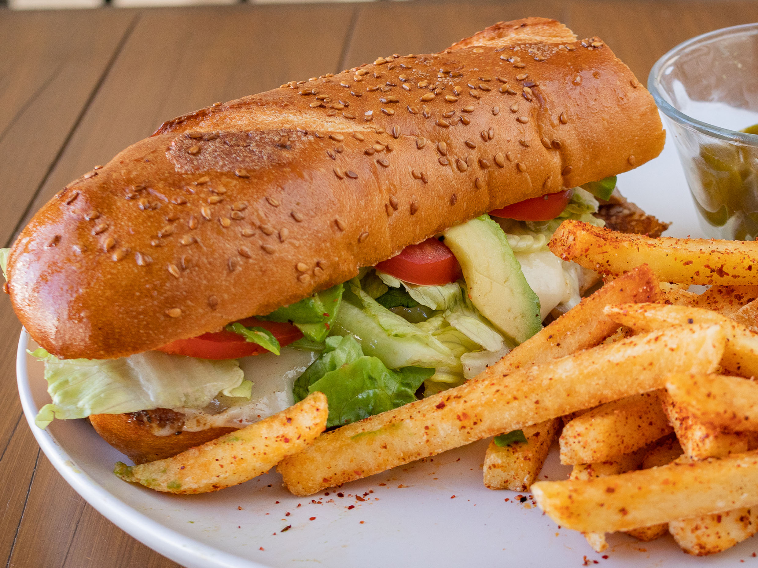 Delicioso pan baguette con pollo a la plancha gratinado con queso mozzarella, rodajas de tomate, lechugas mixtas frescas, frijol refrito y guacamole. Acompañado de papas a la Francesa sazonadas y jalapeños en escabeche.