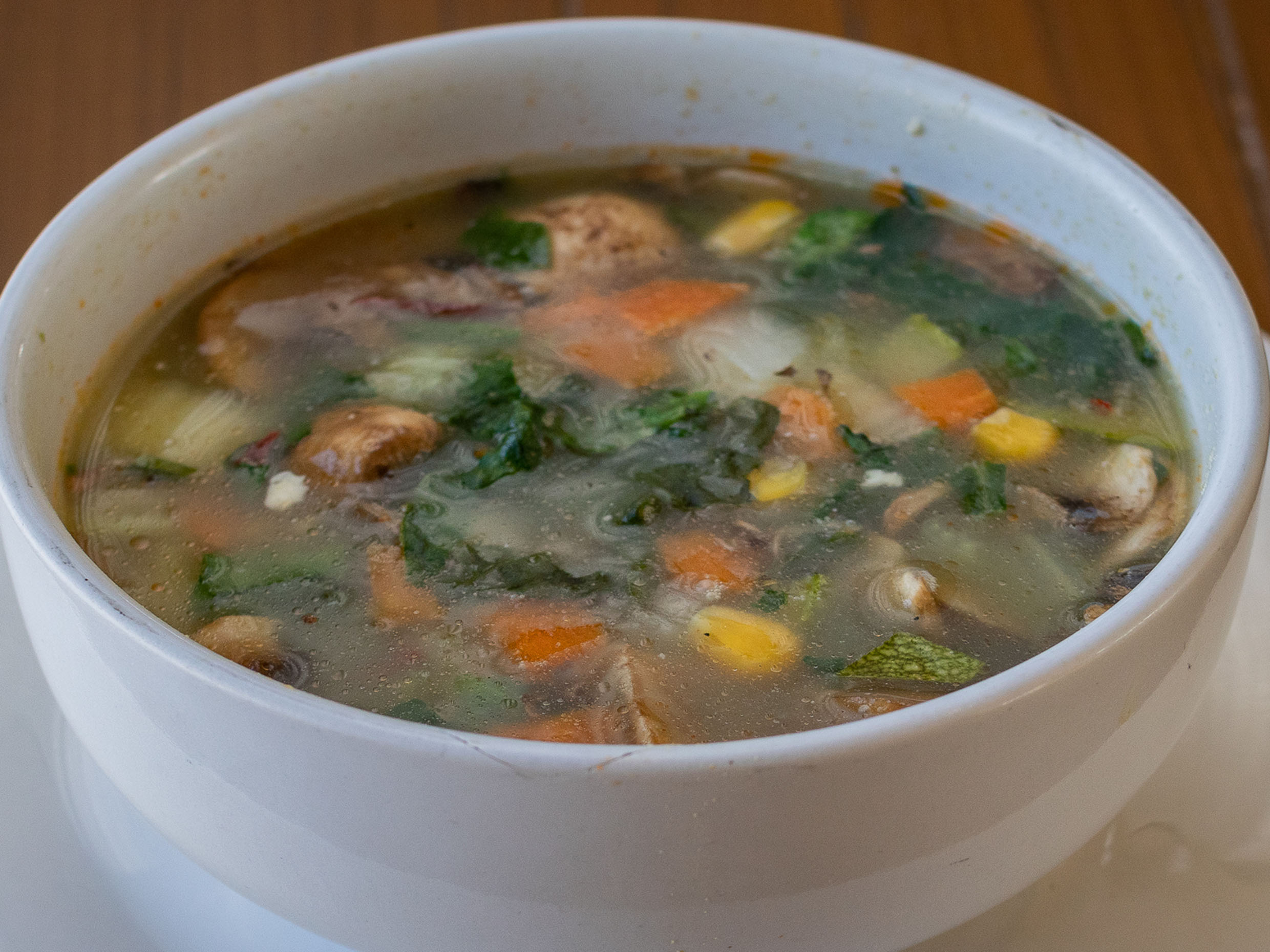Sopa elaborada con verduras mixtas, champiñón, caldo de pollo y trocitos de pasta penne.