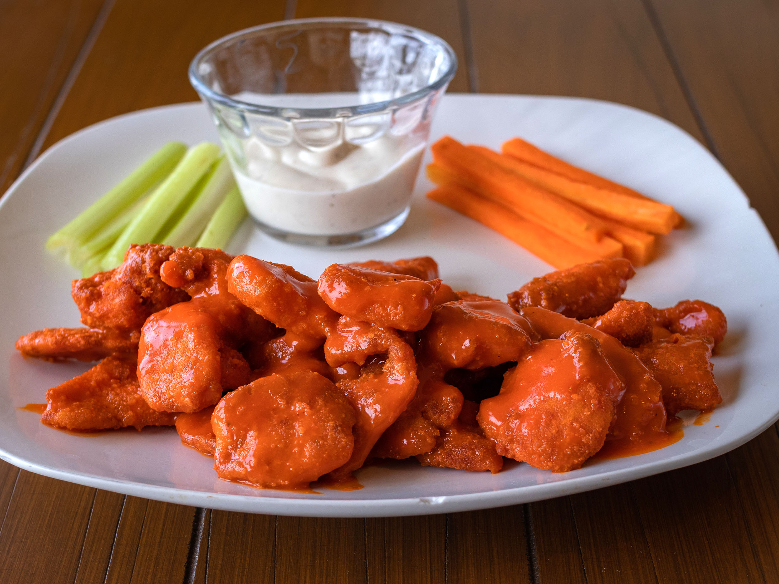 Trocitos de pechuga de pollo empanizados y marinados en salsa búfalo de la casa. Acompañados con aderezo ranch y bastones de apio.