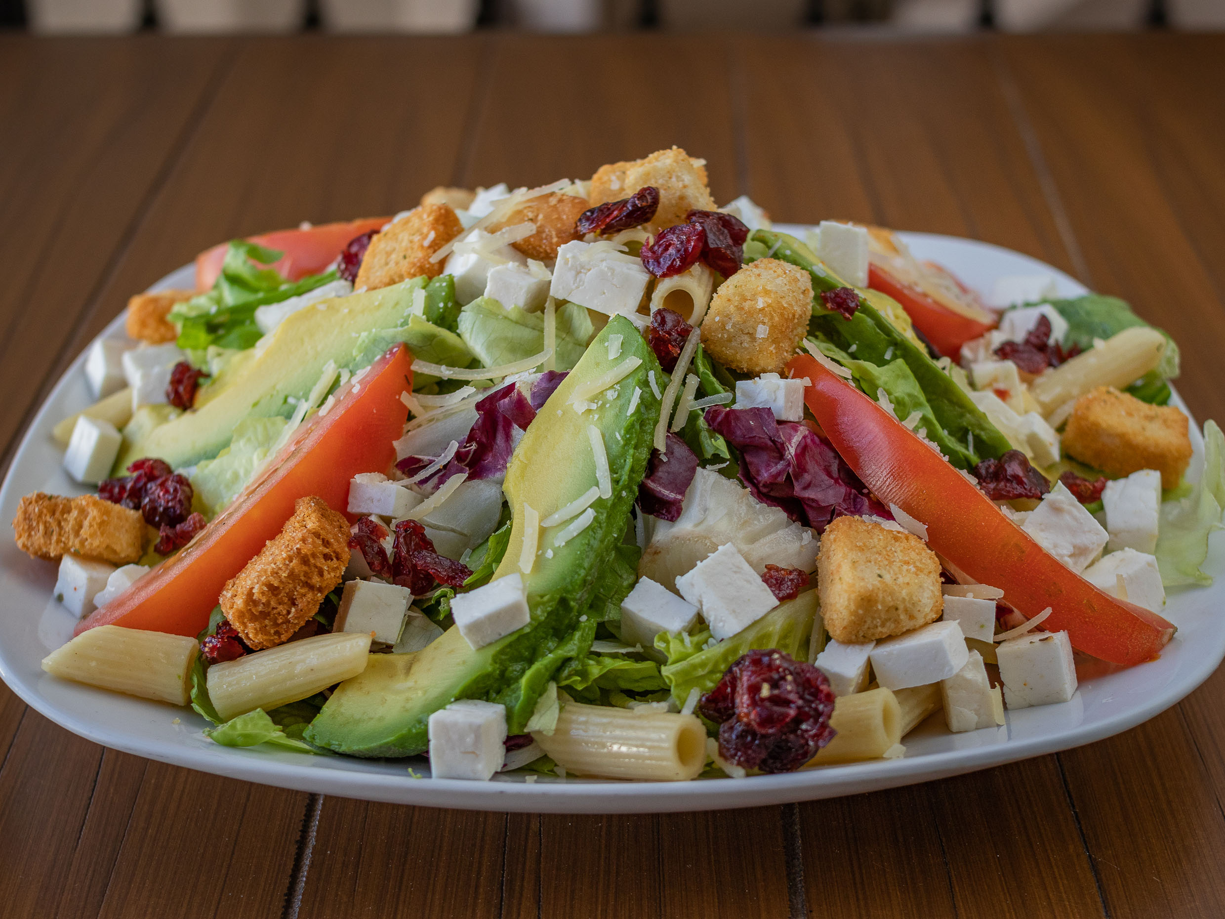 Lechugas mixtas, pasta penne, tomate, aguacate, arándano, queso panela, parmesano y crotones. Acompañada de aderezo Italiano.