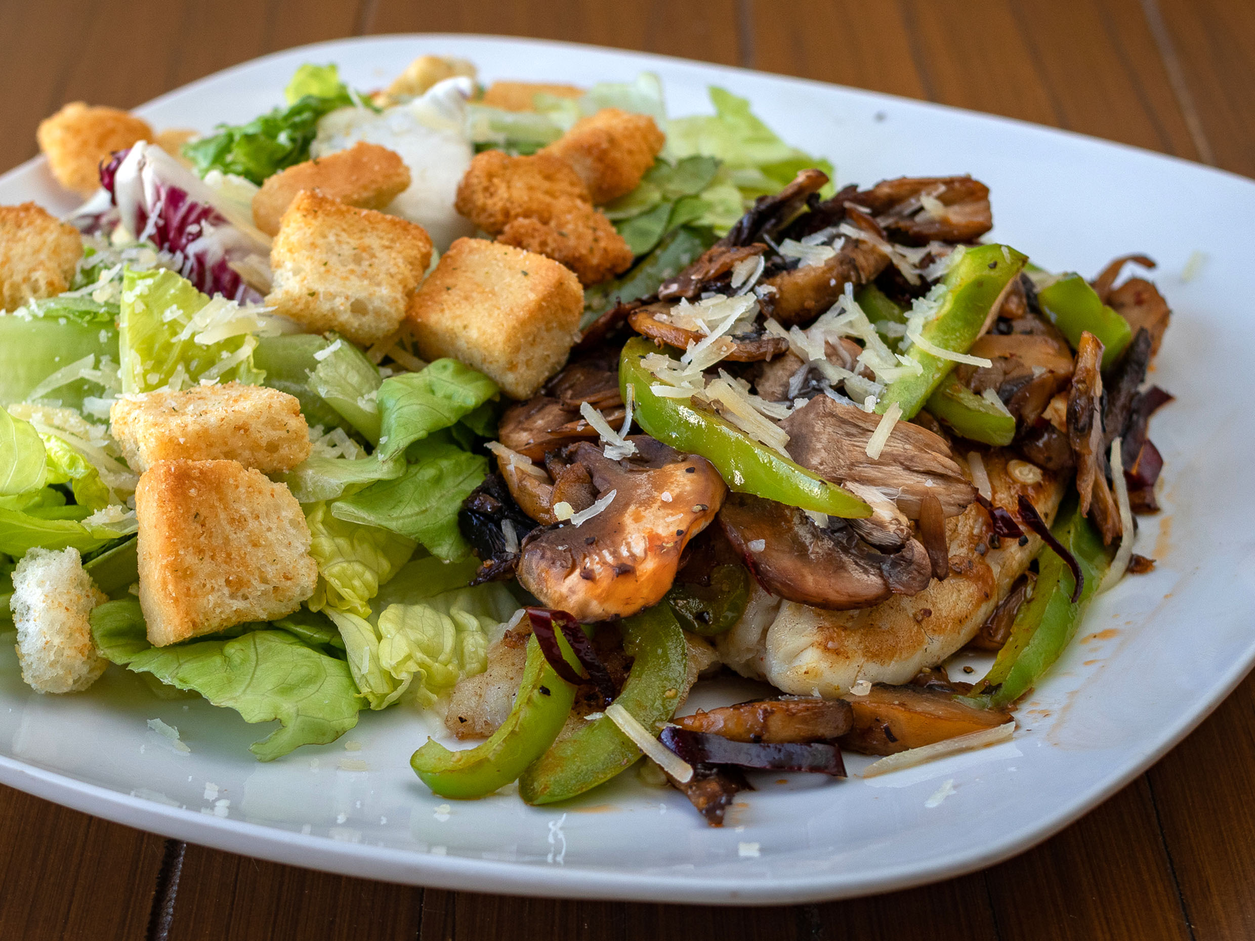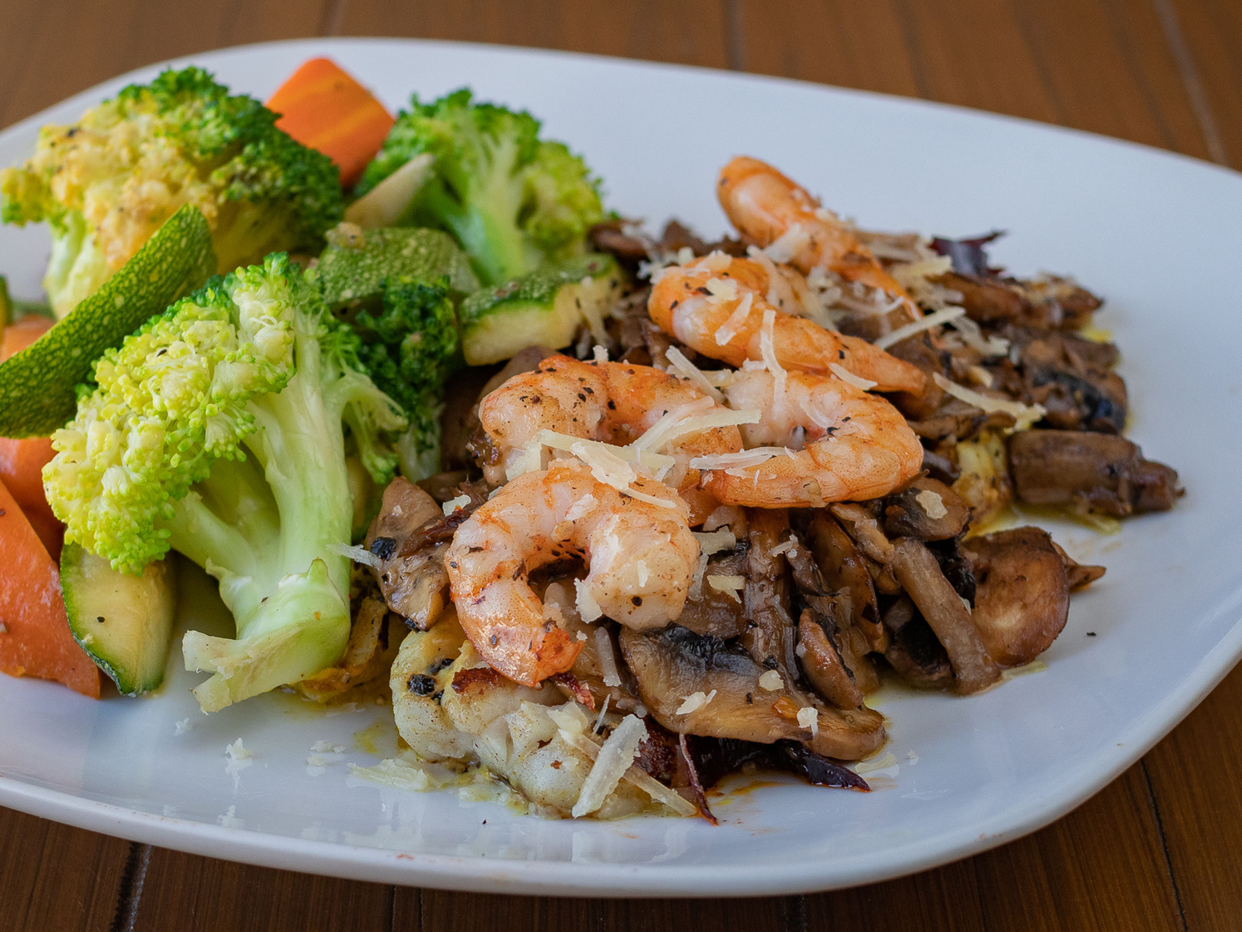 Filete a la plancha marinado con mostaza, coronado con camarones y champiñones al sartén. Guarnición a elegir.