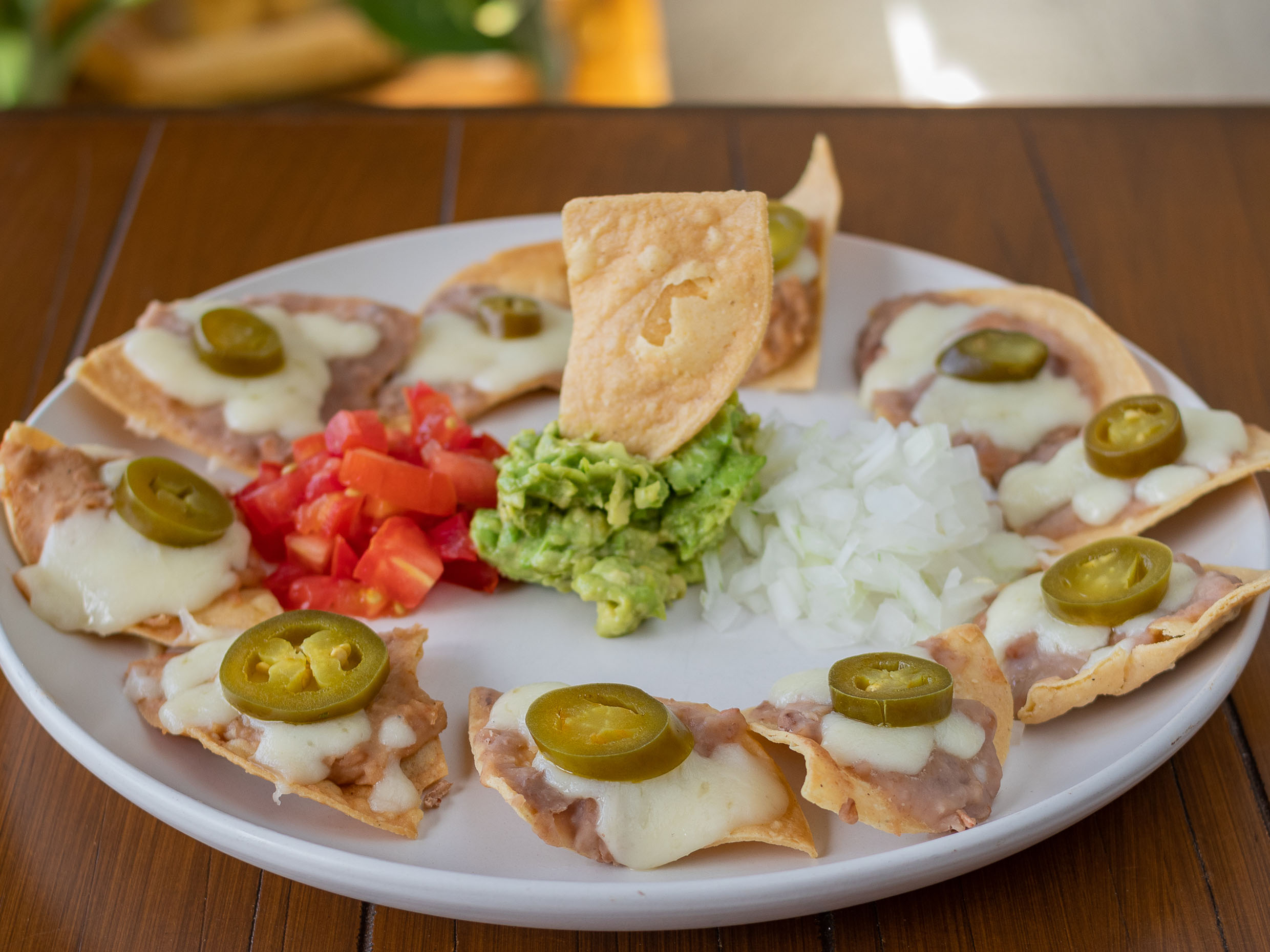 Tortilla dorada con frijoles refritos, queso mozzarella y jalapeño. Acompañados de una bandera de guacamole, tomate y cebolla.