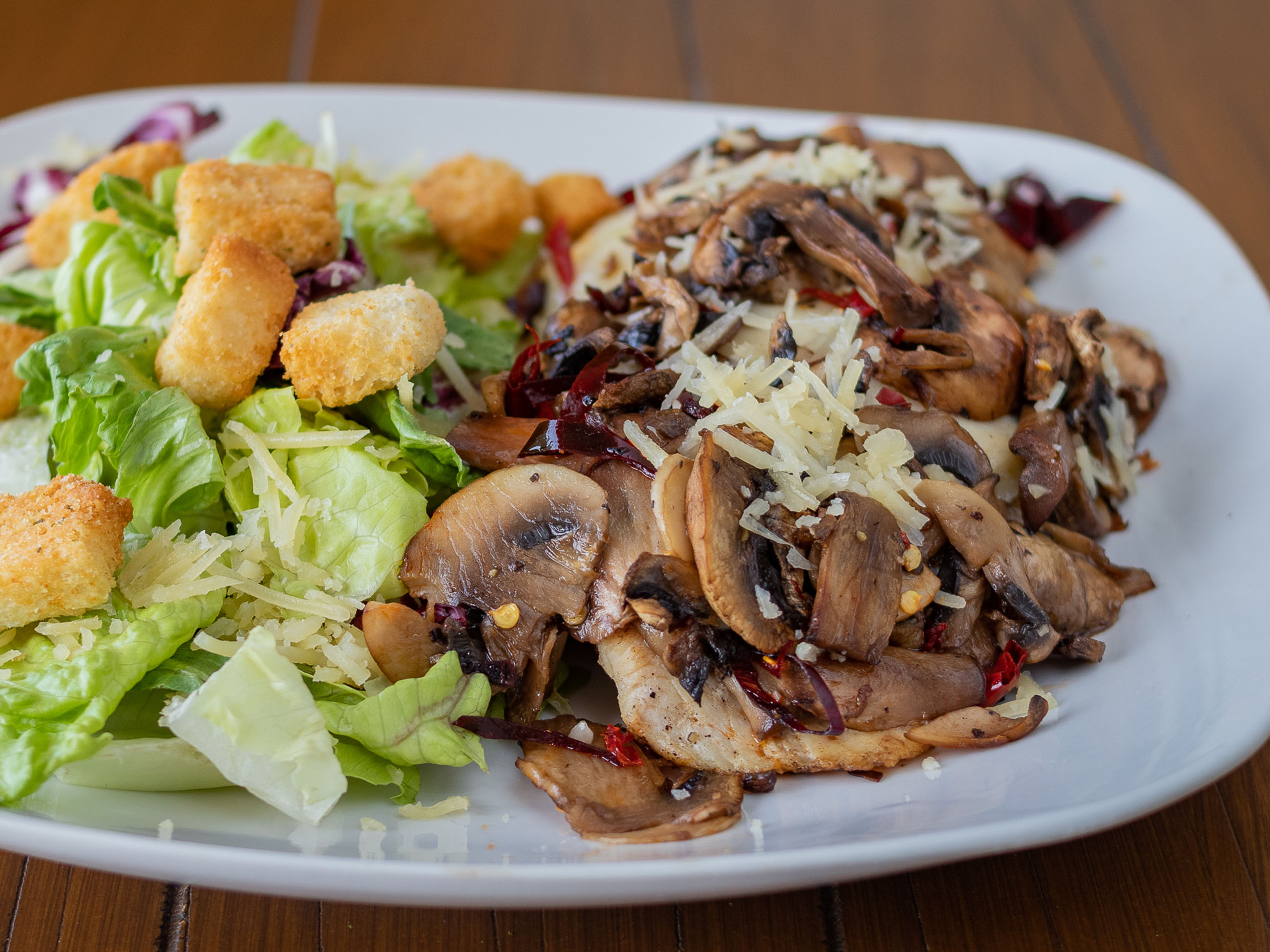 Pechuga de pollo a la placha, gratinada y bañada con champiñones al ajillo y chile de árbol. Guarnición a elegir.