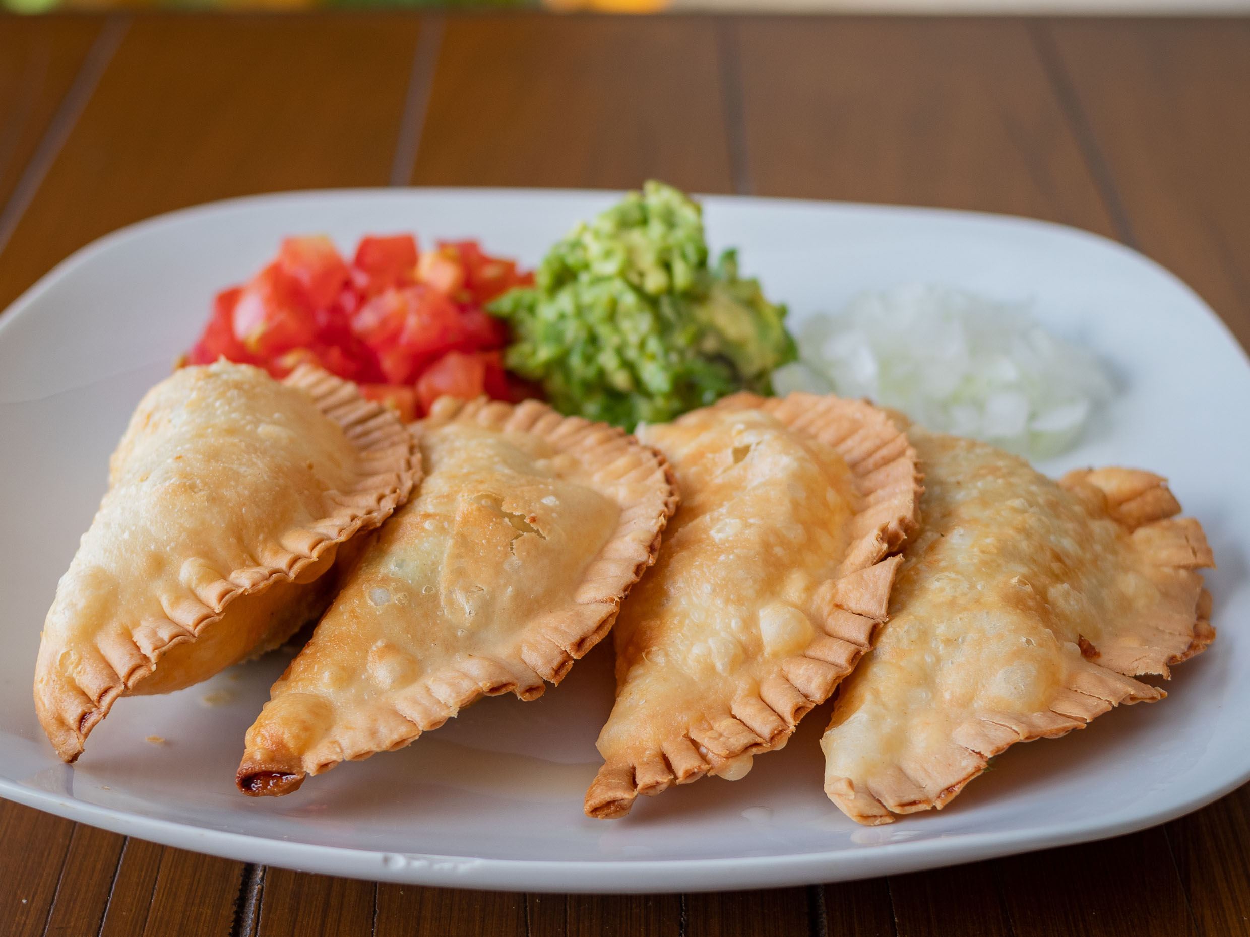 4 Empanadas fritas rellenas: 2 de camarón , espinacas y queso mozzarela; 2 de carne, champiñones y queso mozzarella. Con una bandera de guacamole, cebolla y tomate.