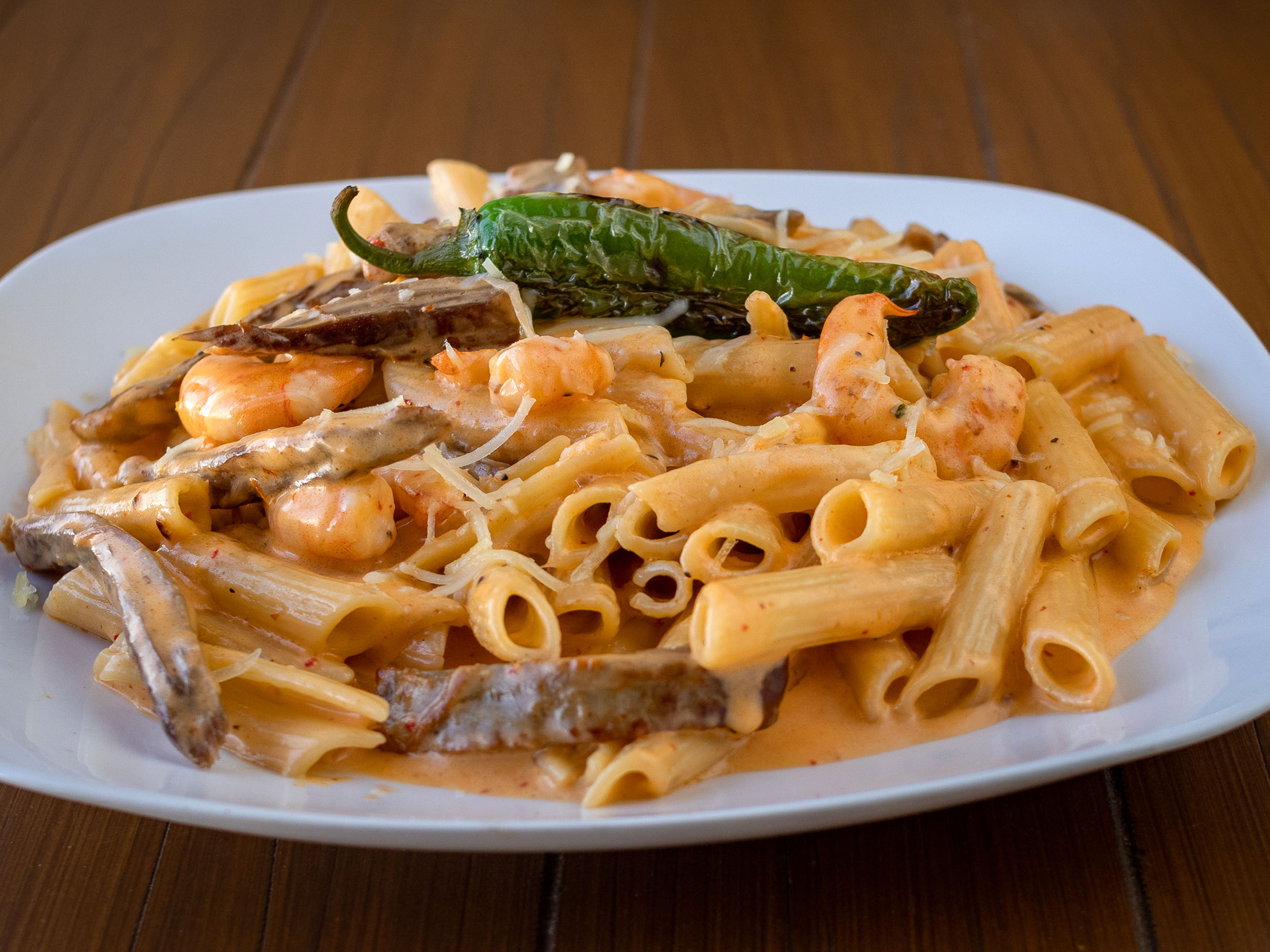Para los amantes de lo picante. Pasta penne en salsa cremosa con chile de árbol, camarones salteados, trocitos de arrachera y queso parmesano.