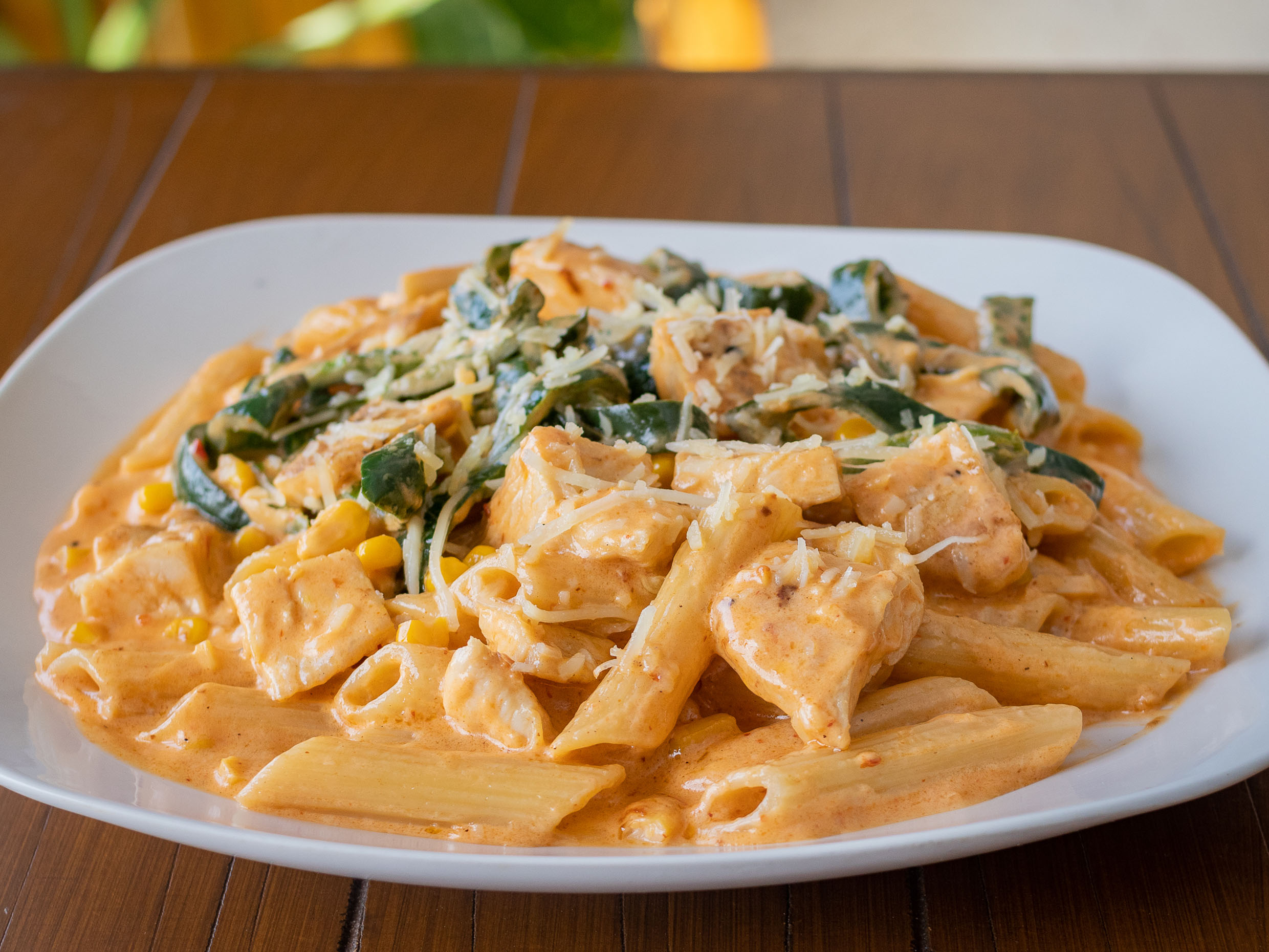 Pasta penne en salsa cremosa con chipotle, trocitos de pechuga de pollo al sartén, rajas de chile poblano y elote.
