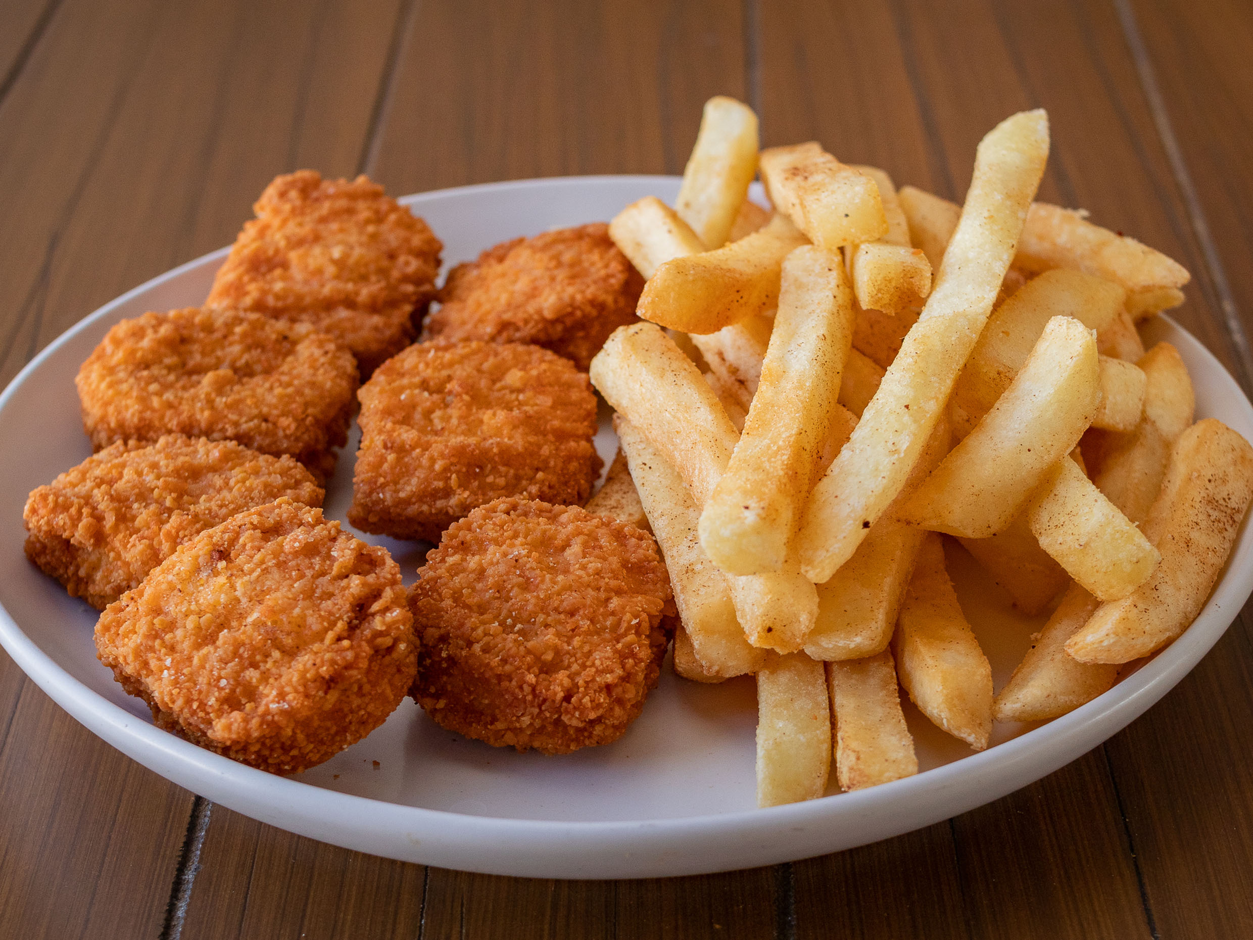 6 Piezas de nuggets de pollo, acompañados de papas a la Francesa.