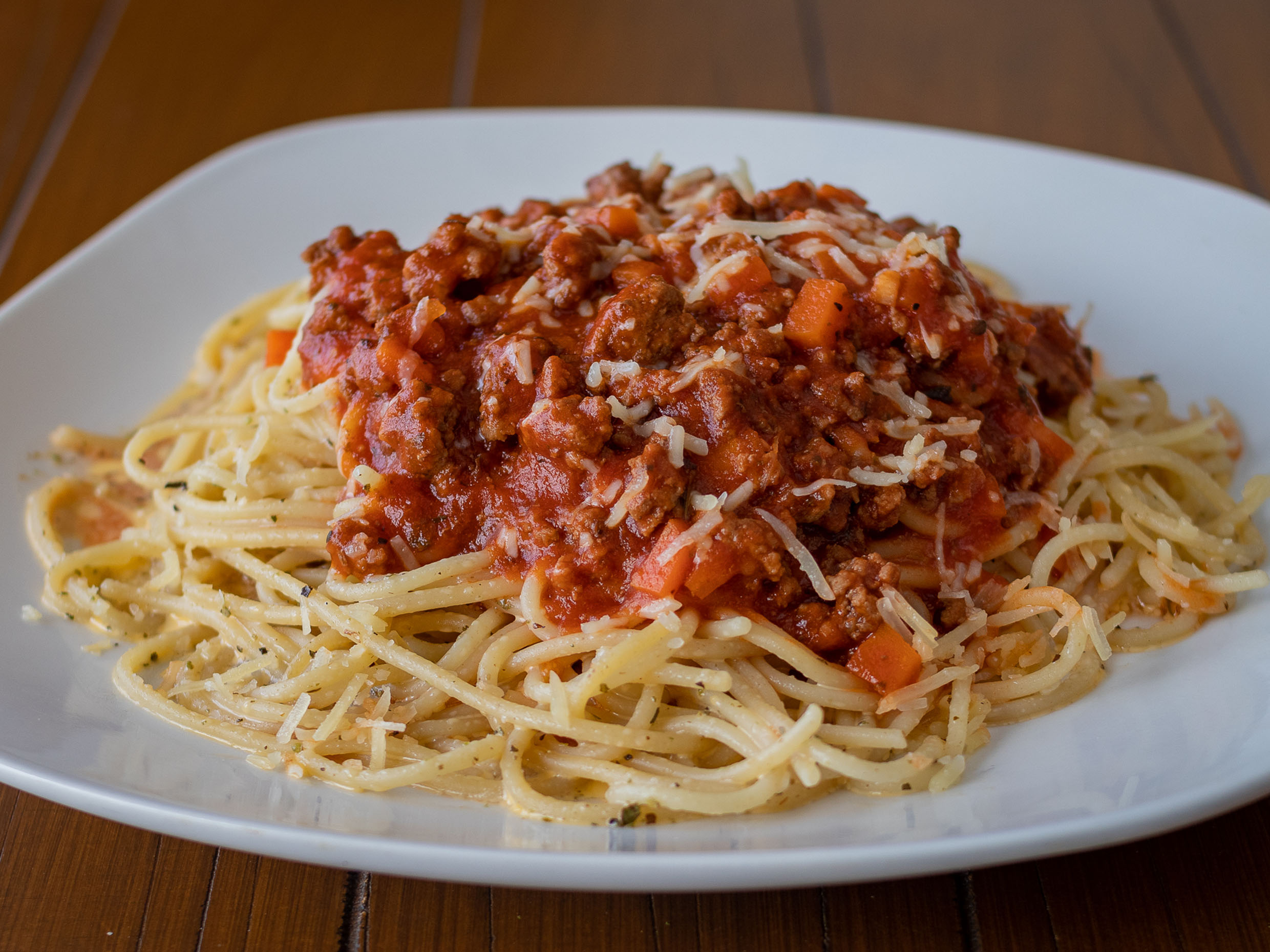 Spaguetti a la mantequilla bañada en salsa de tomate con bolognesa y queso parmesano.