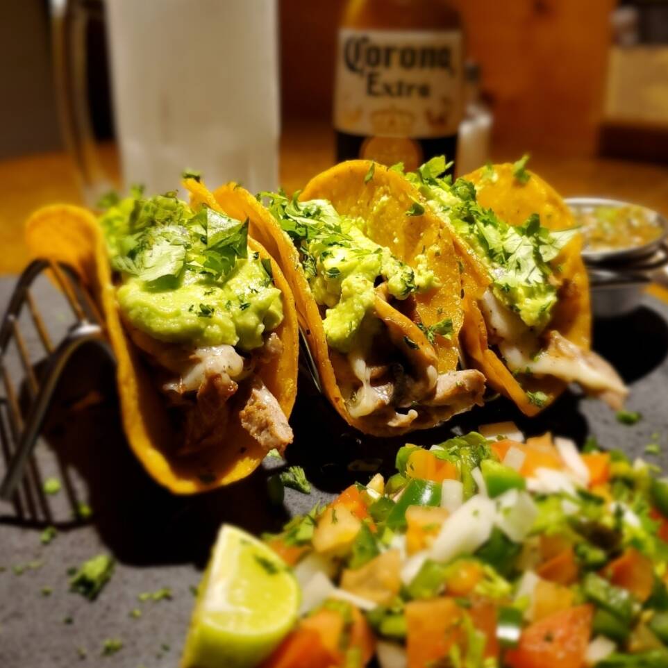 Orden de tres tacos de maíz de nixtamal con arrachera a la plancha con queso mozzarella champiñón y guacamole. Acompañado de una salsa quemada de la casa y pico de gallo.