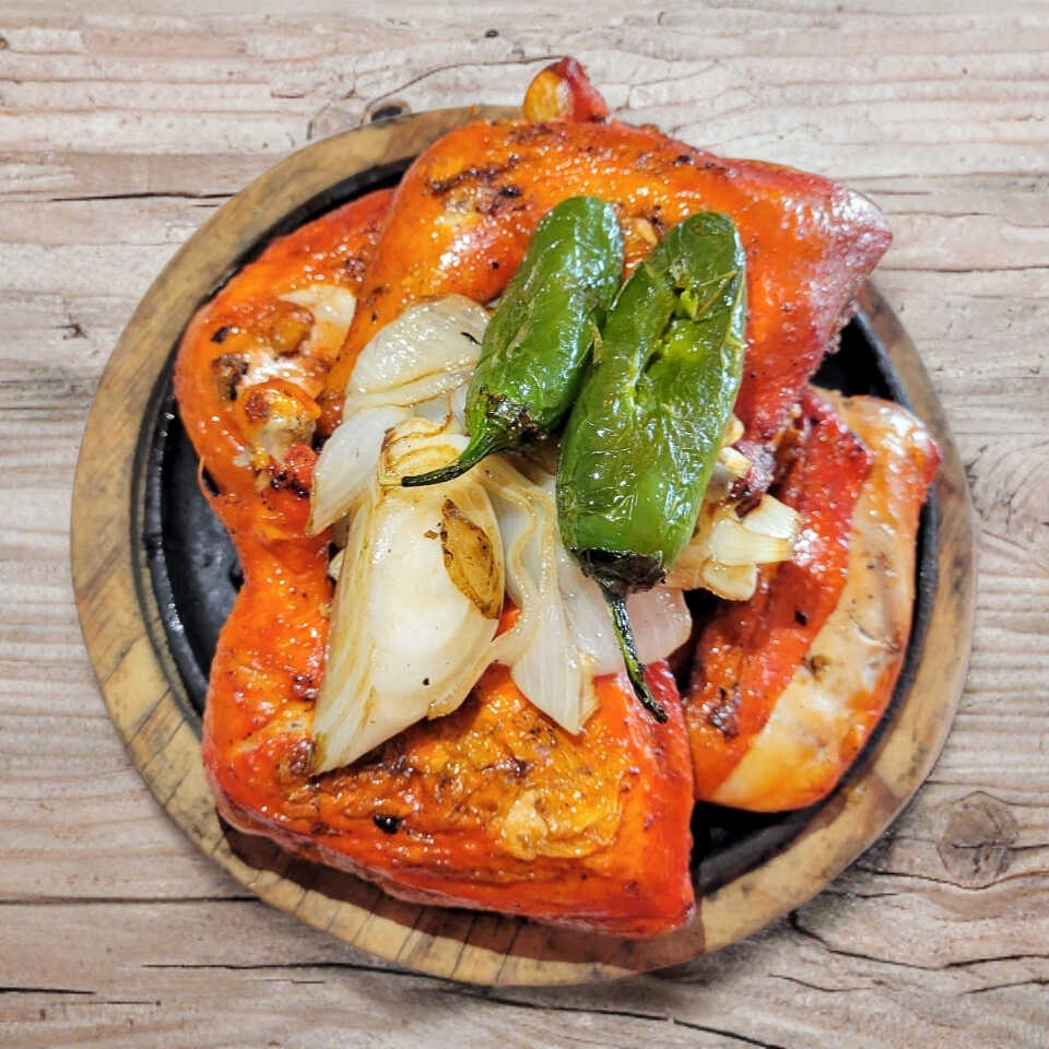 Nuestro delicioso Pollo bañado de una rica y picosita salsa de la casa. Acompañado de Salsa, Cebolla morada, tortillas, frijoles charros y totopos.