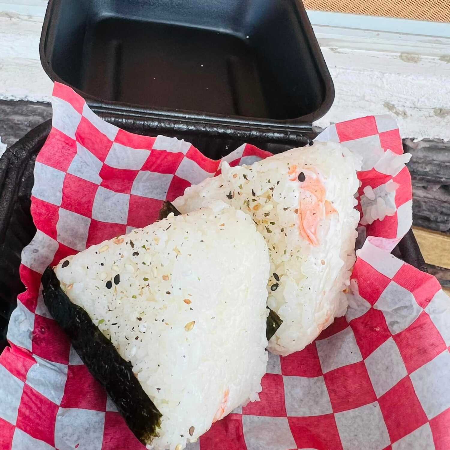 Deliciosos triangulos de arroz al vapor, rellenos de camarón y queso crema, envueltos en alga nori.