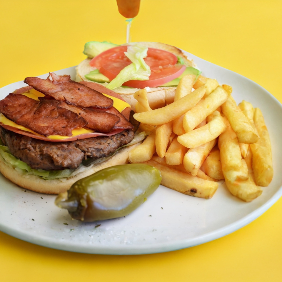 Deliciosa hamburguesa al mero estilo dahabi 200gr de la mejor carne, con aguacate, queso, jamon y tocino.